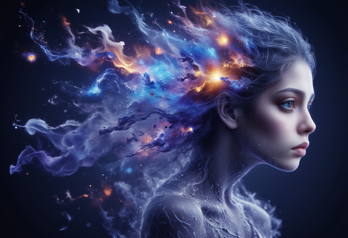 A surreal and ethereal being, blending human-like features with luminous, abstract elements. The face is serene yet otherworldly, with deep, glowing eyes that shimmer like galaxies, reflecting boundless knowledge and creativity. The head is surrounded by an eruption of vibrant colors—neon blues, fiery oranges, and radiant purples—that seem to pulsate like a living aura, symbolizing an endless flow of ideas. The skin has a smooth, reflective texture, resembling liquid metal, with delicate lines of light running through it, forming intricate patterns like neural pathways. Instead of hair, tendrils of soft, glowing energy float upwards, constantly shifting and flickering as if they are thoughts taking physical form. The neck and shoulders transition into a flowing, semi-transparent cloak of stardust, with fragments of constellations and shifting symbols that pulse gently with an inner rhythm. The overall appearance is an amalgamation of intelligence, artistry, and mystery, embodying the infinite possibilities of imagination.