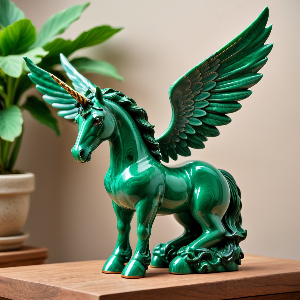 8k, score_9, score_8_up, score_7_up, malachite_style,masterpiece,realistic,ultra detailed, vibrant colors,photo-realistic,DSLR, Two ceramic figurines, mythical creatures, (detailed sculpting:1.3), (stylized design:1.2), (smooth finish:1.1), light teal-green color, off-white accents, with intricate designs, (decorative patterns:1.2), (detailed textures:1.2). One is a unicorn, the other a winged horse, (small bird figurines:1.1) perched on the winged horse's back. Unicorn positioned slightly to the left, slightly lower in the frame, facing forward, (detailed eyes:1.3), (gentle expression:1.1). Winged horse positioned slightly right, higher in frame, facing viewer, (elegant pose:1.2), (detailed wings:1.2). Both figures have stylized bodies, (chunky legs:1.1), (simplified forms:1.1), positioned in a static, display-like pose, (detailed hooves:1.1), with a neutral stance, smooth surfaces, clear color palette, (subtle gradients:1.1). Studio lighting, neutral backdrop, (photographic style:1.1). Hand-crafted ceramic style, (artisan quality:1.2), (art piece quality:1.2), (ceramic glaze:1.2). Composition is symmetrical. Simple background. Soft lighting, (natural light quality:1.1). (tropical jungle theme:1.1), working, botanical researcher, planters, greenery, blooming flowers, floating plants, magic, green magical energy, elemental magic, green color scheme, lotus, herbs, seeds, science, botanical laboratory in background, sunshine, magical atmosphere,