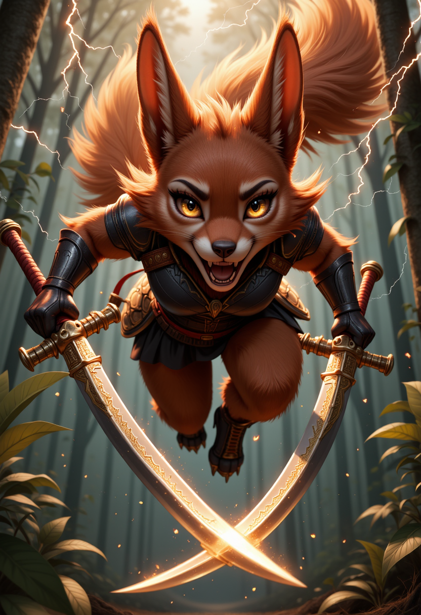 FurFemX. The image is a breathtaking digital artwork in a hyper-realistic, semi-realistic style, capturing a ferocious squirrel woman warrior mid-air, her twin curved blades crackling with lightning as she dives toward her prey. Her fur is a striking mix of deep chestnut and fiery auburn, streaked with battle scars, her massive, bushy tail fanning out like a war banner, charged with static energy. She wears form-fitting, reinforced leather armor, its dark brown and gold design blending seamlessly with the ancient forest around her. A crimson sash flutters wildly at her waist, and fingerless gloves wrap around her clawed fingers, gripping her weapons with unwavering precision. Her piercing amber eyes, filled with the untamed fury of a storm, lock onto a hulking beast emerging from the shadowsâa monstrous predator foolish enough to challenge the queen of the trees.