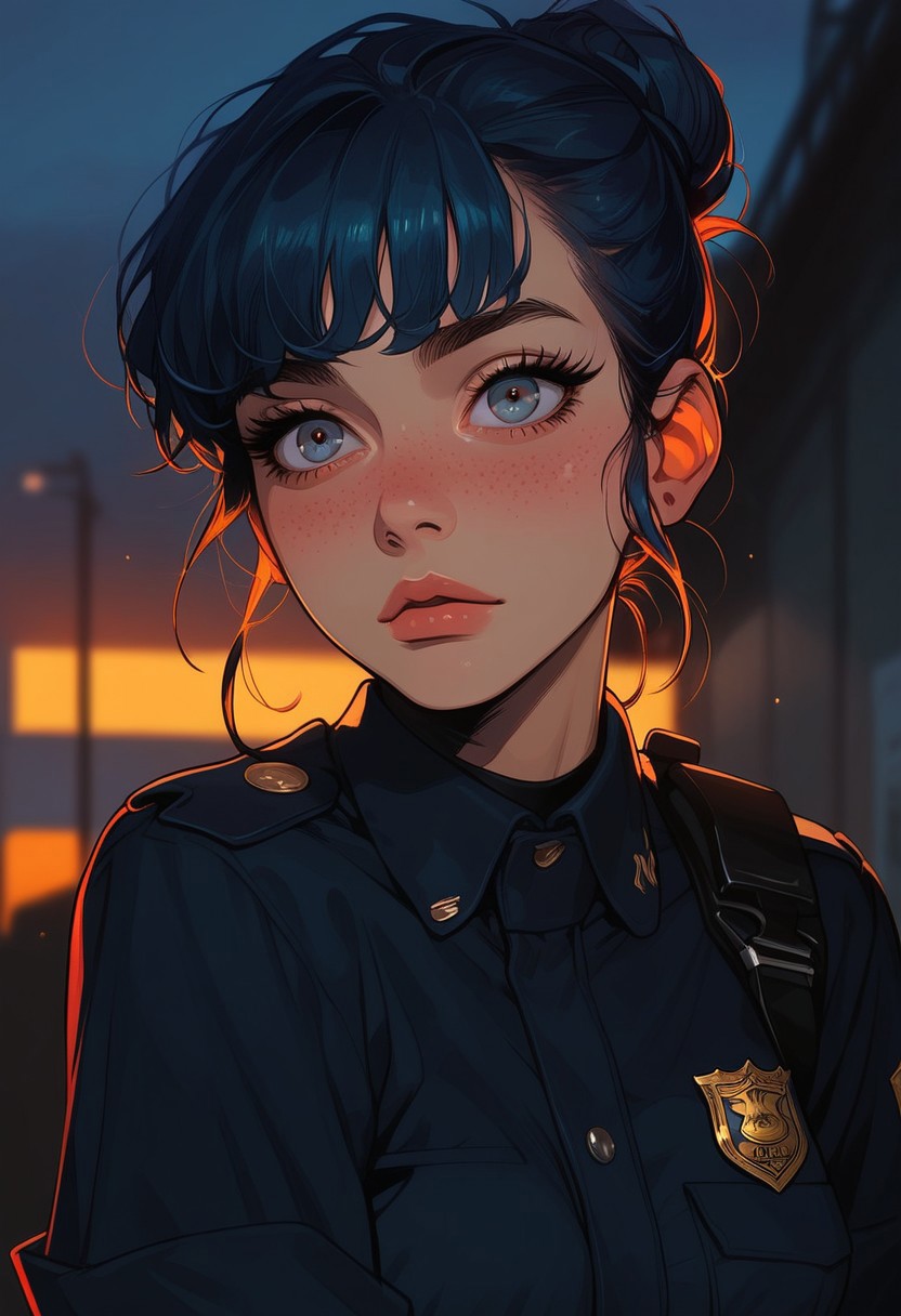 score_9, score_8_up, score_7_up, extremely detailed, Sharp Focus, HD, Skindentation, ((Depth_of_Field)), police woman, Aroused erotic beautiful face, Big eyes, Long eyelashes, Tight shirt gripping her curves, Police trousers, Natural medium breasts, On a patrol , Evening, Blushing, Dark blue hair tied in a bun, Natural light on her erotic skin, Dynamic angle of being cute and aroused