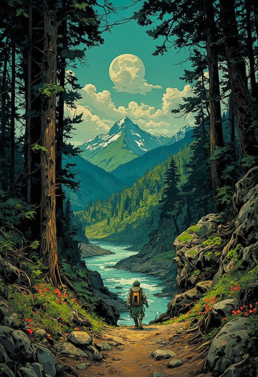 West of Arkham the hills rise wild and there are valleys with deep woods that no ax has ever cut. There are dark, narrow glens where the trees slope fantastically where thin brooklets trickle without ever having caught the glimpse of sunlight. When I went into the hills and vales to survey for the new reservoir, they told me the place was evil. They told me this in Arkham, and because that is a very old town, full of witch legends, I thought the evil must be something which grandmas had whispered to children through centuries. Then I saw the dark westward tangle of glens and slopes for myself and ceased to wonder at anything besides its own elder mystery. In the style of cksc, dreadmirthart, anime, cyberpunk, DB4RZ style painting, DB4RZ,