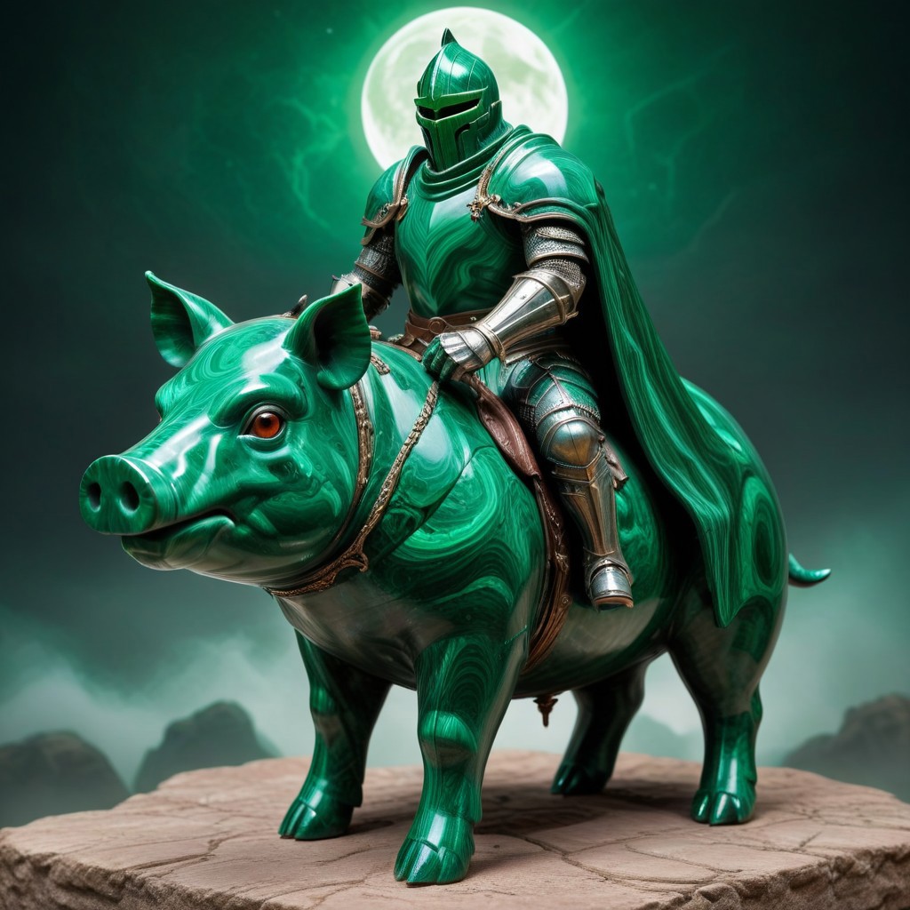 malachite_style, score_10 , score_9_up, score_8_up, score_7_up , score_6_up, a realistic armored knight is riding a pig made of malachite, glowing eyes, armor made of malachite, night background, moon, eerie atmosphere, gothic, grim dark, fantasy art, medieval, detailed light green and grey armor, eerie glow, full armor made of malachite, red glowing eyes, cape made of malachite, rocky ground, fantasy creature, malachite theme, fantasy setting, high contrast, detailed malachite textures, ominous, realistic lighting, haunting, eerie glow, medieval fantasy, gothic style, detailed rendering, fantasy character, malachite ambiance, eerie environment, fantasy creature, armored knight, glowing eyes, riding a pig, knight over pig, pig, realistic castle, castle made of malachite, castle background, smiling