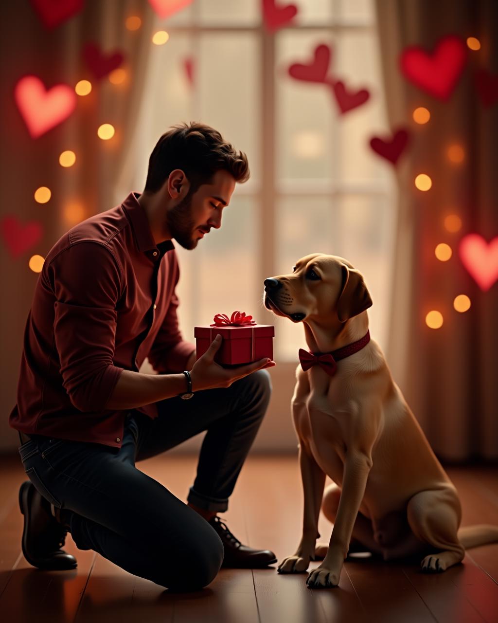 A charming man in his 30s kneeling on one knee, presenting a small gift box tied with a red ribbon to his dog, a playful Labrador. The dog tilts its head curiously while wearing a red bowtie. The background features a softly blurred Valentine's Day setting, with glowing fairy lights and red heart decorations. Cinematic composition, ultra-realistic rendering, warm and intimate atmosphere. <lora:add-detail-xl:0.5>