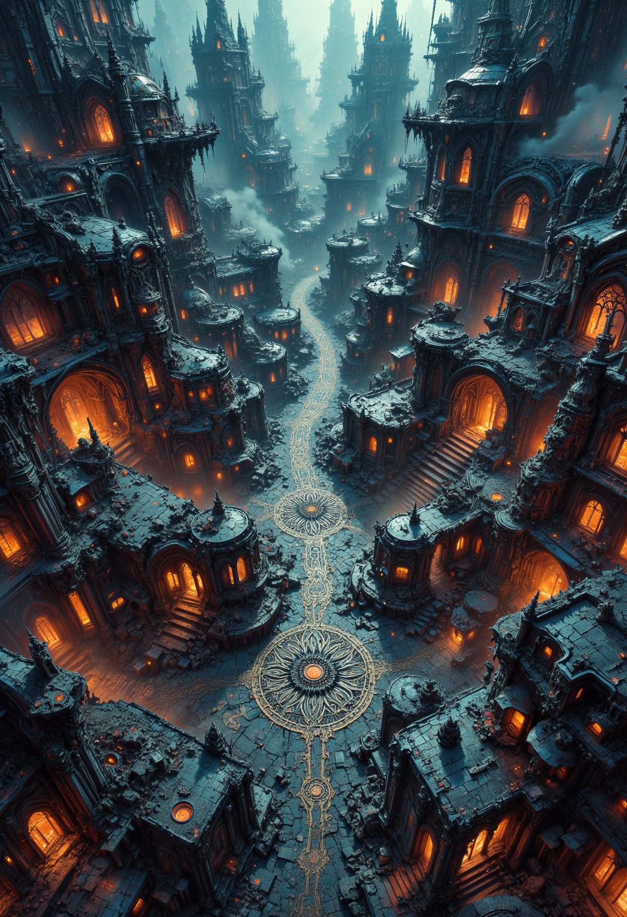 Bird's-eye view, ancient cyberpunk settlement, cyberpunk and gothic fusion. Intricate spatial composition, geometric planning, strategic shapes and brutalist patterns. Clustered gothic cyberpunk structures, neon lights, and bold gargoyle sculptures. Atmospheric interplay, ambient light, dynamic shadow, rich hues. Detailed architectural nuances, mosaic-like pathways, designed streets. Steampunk artifacts, monumental architectural details. Technical quality 8k, masterpiece, hyper-detailed imagery, intricate design, evocative textures, ethereal light, timeless narrative. <lora:flux-photo_v6:0.4> <lora:VividlySurrealOrigin:0.6> <lora:Dever_Flux_Enhancer:0.6> <lora:42lux-UltimateAtHome-flux-highresfix:0.25>