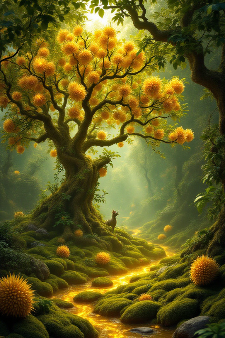 Visualize a lush, otherworldly garden where durian trees grow to towering heights, their branches heavy with glowing, jewel-like fruits. The ground is carpeted with soft, velvety moss, and streams of golden nectar flow through the landscape. In the center, a majestic durian tree blooms with flowers that emit a mesmerizing fragrance, attracting mythical creatures like phoenixes and unicorns. The air is filled with a soft, golden mist, and the entire scene feels like a dreamy, utopian paradise.