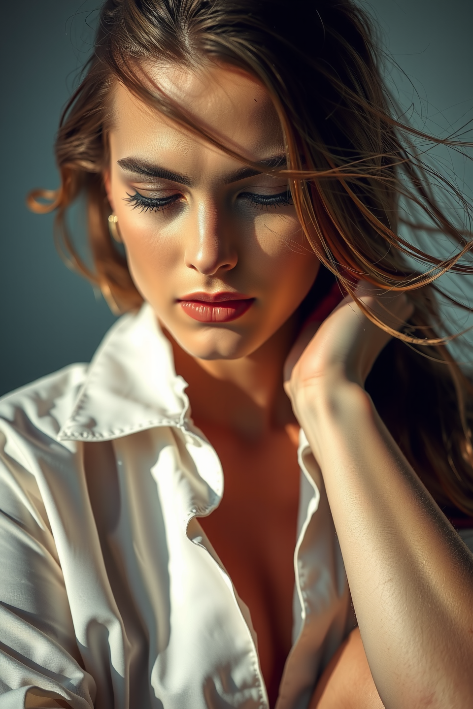 masterpiece facial portrait, incredible realism, face focus, intimate close up, very near her beautiful face, in love, waist-up portrait, photography kodak portra by wildly artistic photographer (george hoyningen-huene), (filippo sano), best, award-winning, the most beautiful 20 year old russian girl ever in a dramatic expression: stoic, looking down and artistic self-embraced composure, her face is gloriously pretty, she has small breasts, she is wearing an unbuttoned white men's dress shirt, her elegant long hair wraps about her face in the most flamboyant and expressive hairstyle, detailed skin goosebumps, realism, sun tanned skin contrasts against the bright background, dramatic lighting