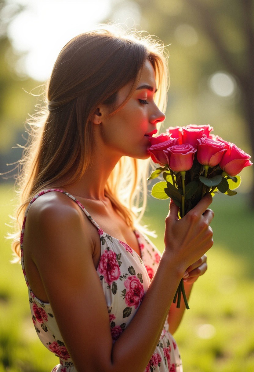 valentine's day, a woman, picnic, smelling a bouquet of roses, sunny, wearing a floral sundress,