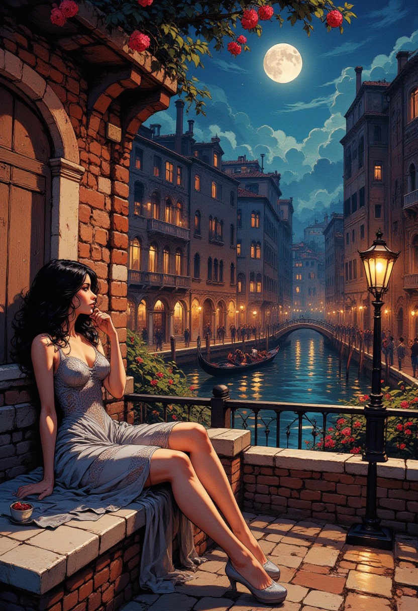 Moonlit Night in a Venetian Courtyard "Under the soft glow of the full moon, a woman with dark wavy hair lounges on a marble bench in a Venetian courtyard. She wears a pastel silver-grey dress with intricate lace detailing, shimmering in the moonlight. The quiet canal reflects the lights of old stone buildings, and a gondola drifts lazily in the distance. A wrought iron lantern casts flickering shadows on the cobbled path, creating a scene of quiet elegance."
