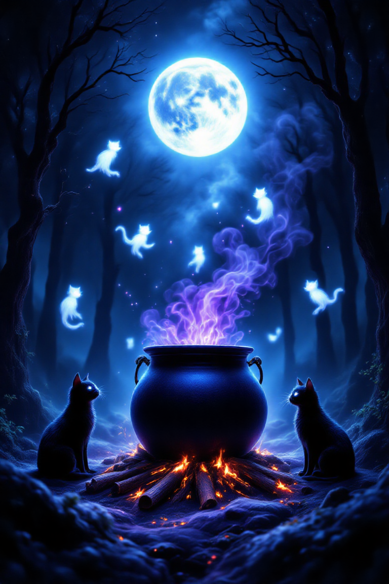 This image is a digital artwork featuring a mystical and enchanting scene. Here's an analysis of its key elements: 1. **Setting**: The scene takes place in a dark, dense forest at night. The backdrop consists of tall trees silhouetted against the moonlit sky. 2. **Moon**: A large full moon hangs prominently in the center of the sky, casting a soft glow over the entire scene. 3. **Floating Cats**: Surrounding the moon are four ethereal white cats with glowing eyes. They appear to be floating or leaping through the air, adding a magical element to the composition. 4. **Cauldron**: In the foreground, there is a large black cauldron placed over a small fire made from logs. Purple smoke rises from the cauldron, suggesting it contains some sort of potion or spell. 5. **Black Cats**: Two black cats sit on either side of the cauldron, facing inward as if observing or guarding the cauldron. Their eyes are illuminated by the light of the fire and the moon. 6. **Fire**: Small fires burn around the base of the cauldron, providing additional illumination and enhancing the mystical atmosphere. 7. **Color Palette**: The color palette includes deep blues, purples, blacks, and contrasting bright whites for the floating cats. These colors contribute to the overall mysterious and magical mood of the piece. 8. **Style**: The artwork has a detailed and illustrative style, reminiscent of fantasy illustrations often seen in children's books or fantasy art. Overall, the image conveys a sense of magic and mystery, likely intended to evoke feelings of wonder and enchantment.,velvet_myst,aidmafluxpro1.1