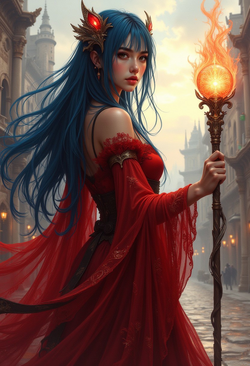 A high-quality digital artwork in the style of pinkdarkcanvas,, masterpiece, best quality, good quality, very aesthetic, absurdres, newest, 8K, depth of field, focused subject, BREAK asian young sorceress, vivid blue hair, circlet, bangs, sidelocks, gauzy, filmy red mage robes adorned with arcane symbols, holding mage staff (with glowing orb), casting spell, ancient fantasy city, standing in dynamic pose, golden hour, directional lighting, vibrant colours, dutch angle