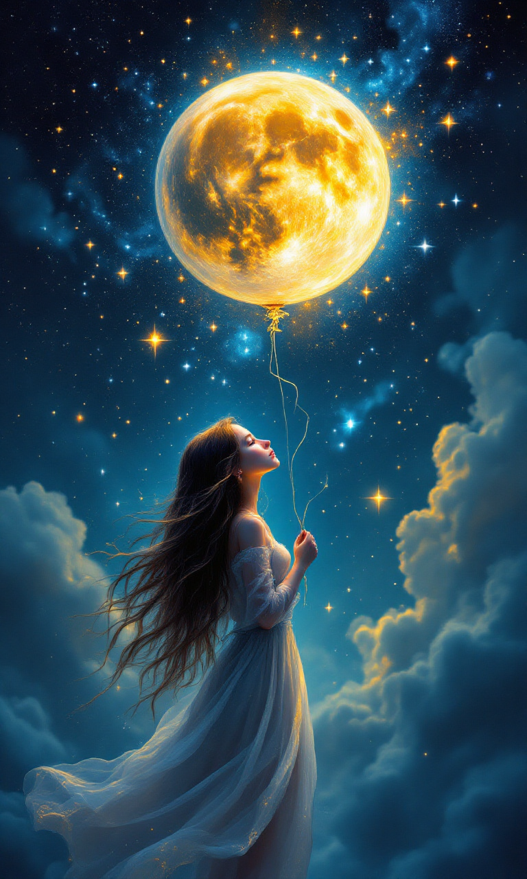 Whimsical dreamscape of a girl holding a moon-shaped balloon against a starry sky backdrop, infused with impressionist and fantasy realism elements. Painterly illustration style shines with golden yellow and blue hues, simplicity, and high definition. The scene's tranquility is maintained by the gentle blowing of her long hair in the wind. The subject stands tall, her skirt flowing freely, as she grasps an oversized balloon resembling a full harvest moon galaxy, suspended above the earth at midnight. Her entire figure is bathed in starlight, creating a breathtaking magazine cover-style masterpiece.,velvet_myst,aidmafluxpro1.1