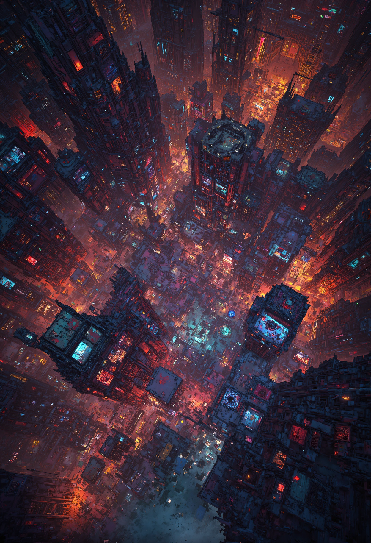 Bird's-eye view, ancient cyberpunk settlement, cyberpunk and gothic fusion. Intricate spatial composition, geometric planning, strategic shapes. Buildings that are fusions of gothic cathedrals and futuristic skyscrapers. Clustered gothic cyberpunk structures, neon lights, and bold gargoyle sculptures. Atmospheric interplay, ambient light, dynamic shadow, rich hues. Detailed architectural nuances, mosaic-like pathways, designed streets. Steampunk artifacts, monumental architectural details. Technical quality 8k, masterpiece, hyper-detailed imagery, intricate design, evocative textures, red and blue neon lighting, timeless narrative. <lora:JJsCyberPunkCity_Flux:0.6> <lora:VividlySurrealOrigin:0.4> <lora:42lux-UltimateAtHome-flux-highresfix:0.25>