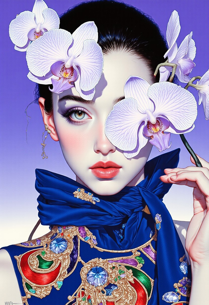 A high-resolution ArsMJStyle, colored pencil hyper-detailed realism featuring an Asian woman with an elegant, serene expression. She has smooth, fair skin and a delicate, petite build. Her dark hair is styled in a high ponytail, emphasizing her refined features. Her face is framed by striking gothic makeup—deep, smoky black eyeshadow extending dramatically past her almond-shaped eyes, sharp winged eyeliner, and bold matte black lips that contrast against her porcelain-like complexion. A striking deep sapphire blue scarf is tied around her neck, its soft fabric adding a delicate contrast against the cool periwinkle background, creating a harmonious and ethereal effect. Her face is partially obscured by large, surreal orchids whose petals are entirely crafted from sparkling rhinestone diamond simulants, each facet catching light and reflecting dazzling hues of crystal white, sky blue, and soft lavender. The orchids emerge from thin, twisting stems that seem to grow from her forehead, enhancing the dreamlike, avant-garde aesthetic. She wears a fitted, sleeveless navy top adorned with intricate, multicolored embroidery in swirling floral and celestial motifs, stitched in shimmering gold, emerald green, and fiery crimson thread. The cool-toned background envelops the scene in a luminous glow, highlighting the interplay between her richly decorated attire, the shimmering gemstone florals, and her gothic allure. The overall composition is a fusion of high fashion and surreal beauty, seamlessly blending nature with futuristic contemporary artistry.