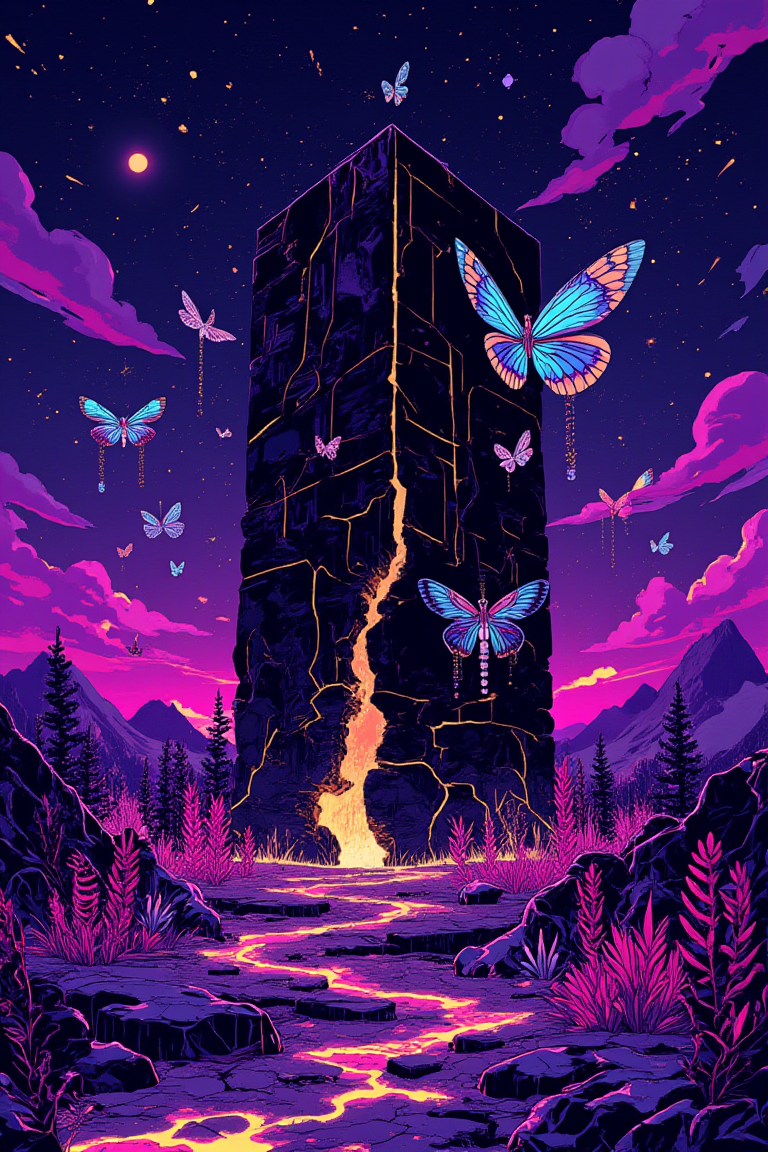 reminiscent of Keith Negley's retro illustrations, features bold flat lines and shadows, terrain stretch out in a line-art style, evoking nostalgia and simplicity. Medium shot with exaggerated depth, slight fisheye distortion. R3alisticF, A colossal monolith stands in the center of a vast, luminescent field, its obsidian-black surface cracked open, revealing pulsating veins of golden light. From within, enormous translucent moths emerge, their wings resembling delicate stained glass with shifting patterns of deep indigos and glowing pinks. The air vibrates softly as they ascend into the violet sky, leaving behind trails of shimmering dust that dissolve into spirals of cascading neon particles. The ground itself breathes, pulsating with waves of bioluminescent flora, their tendrils curling and shifting as if reacting to unseen rhythms. The monolith hums with an ancient, sorrowful melody, resonating through the glowing landscape like the heartbeat of something long forgotten.