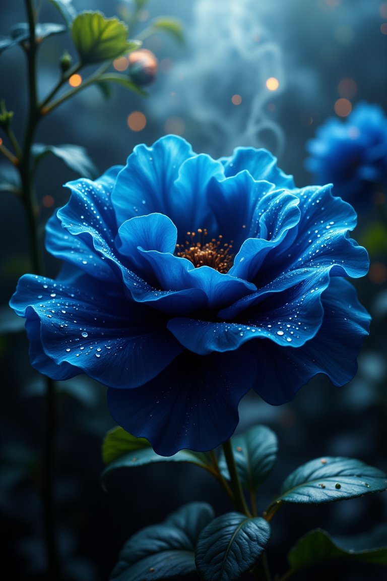"A close-up of a beautiful black and Blue rose with dew drops on its petals, glistening under the soft light of a rainy day. The petals are rich, velvety, and deep Blue, with delicate rain droplets scattered across the surface, reflecting the light. The background is blurred, showing hints of green leaves and a soft mist, evoking a calm, serene atmosphere. The texture of the rose is enhanced by the wetness of the raindrops, giving the flower a fresh, vibrant look. The image conveys both elegance and tranquility, with a sense of natural beauty and renewal.",(masterpiece), best quality, expressive eyes, perfect face,(UHD:1.1),colors,(hyper detailed:1.1),intricately detailed,(fantastical:1),intricate detail,splash screen,(fantasy:1),(4k resolution:1),(masterpiece:1.1),complex background,(intricate detailed:1.1),bright colors,concept art,digital art,intricate,expert,insanely detailed,velvet_myst,aidmafluxpro1.1