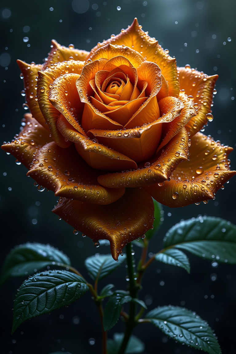 "A close-up of a beautiful black and gold rose with dew drops on its petals, glistening under the soft light of a rainy day. The petals are rich, velvety, and deep gold, with delicate rain droplets scattered across the surface, reflecting the light. The background is blurred, showing hints of green leaves and a soft mist, evoking a calm, serene atmosphere. The texture of the rose is enhanced by the wetness of the raindrops, giving the flower a fresh, vibrant look. The image conveys both elegance and tranquility, with a sense of natural beauty and renewal.",(masterpiece), best quality, expressive eyes, perfect face,(UHD:1.1),colors,(hyper detailed:1.1),intricately detailed,(fantastical:1),intricate detail,splash screen,(fantasy:1),(4k resolution:1),(masterpiece:1.1),complex background,(intricate detailed:1.1),bright colors,concept art,digital art,intricate,expert,insanely detailed