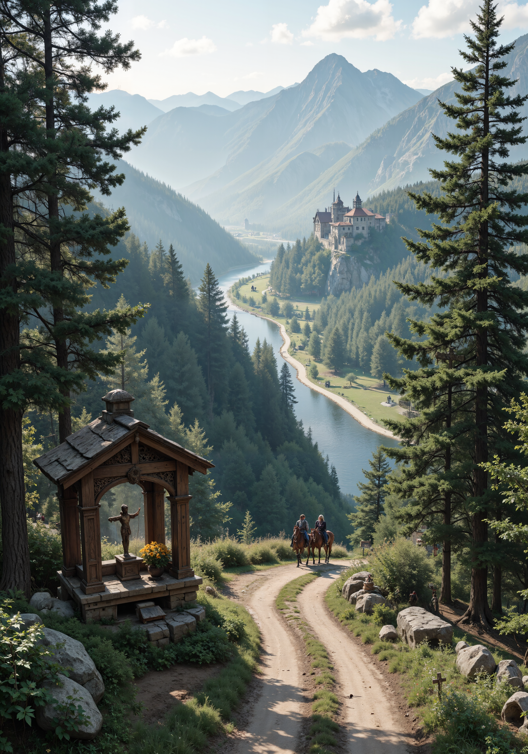 Misty Bohemian mountainscape, early 15th century, sprawling evergreen forests, rugged peaks. Winding dirt road, medieval travelers on horseback, ornate period-accurate clothing. Distant hilltop monastery, stone walls, red-tiled roofs. Foreground: weathered wayside shrine, intricately carved wooden crucifix, offerings of wildflowers. Soft morning light, dappled shadows, ethereal atmosphere. Rich earthy tones, deep greens, muted grays. Hyper-detailed textures: rough-hewn stone, weather-worn wood, supple leather. Wispy clouds, hints of blue sky. 8k resolution, photorealistic rendering, masterful composition. Evocative scene capturing essence of 15th century Bohemian countryside, blending natural beauty with religious devotion and daily life. <lora:ck-charcoal-drawing-000014:0.6> <lora:boFLUX Double Exposure Magic v2:0.3> <lora:UkiyoFusion-FLUX:0.3> <lora:nwsj_flux0924:0.7> <lora:SameFace_Fix:0.4> <lora:aidmaBaldursGate3-FLUX-v0.1:0.3> <lora:flux_dev:1>