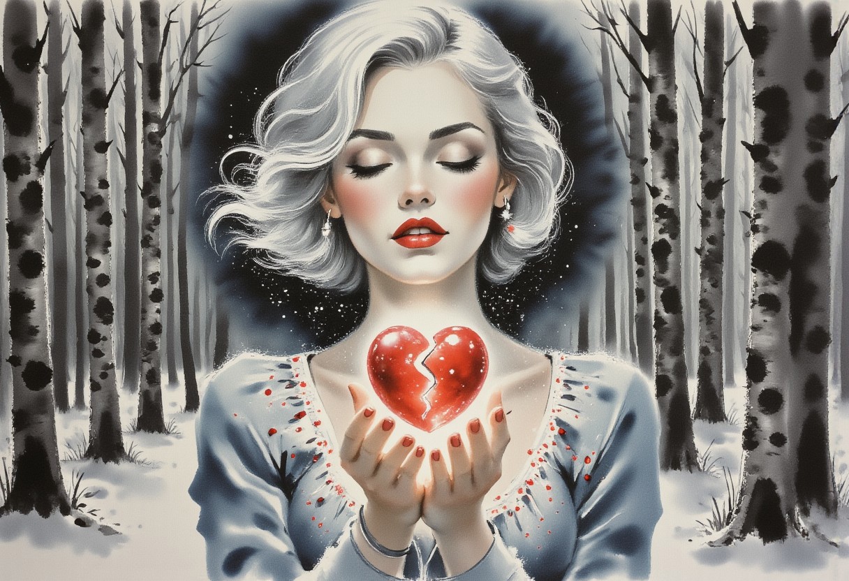 Valentine's Day theme On Valentine's Day, we present a realistic scene that shows a woman with red lips, short blonde hair flowing down, and half-closed eyes. She holds a glowing glass ball in the shape of a broken heart and seems to be praying, being behind frosted glass, on which water droplets can be seen. Her face is completely covered in frost, giving the impression that she is inside the stage. The whole painting is made in the technique of double exposure: a forest behind textured double frosted glass with obvious water drops covers the entire canvas. Frosty vibrations created with the help of double frosted glass effects create an atmosphere of fabulousness and mystery. A 3D textured brush stroke, dark background, and shades of white, red, black, gold, blue, and bronze inspired by nature create a harmonious mix of colors. The pastel color palette, the most free watercolors and whimsical natural motifs give the picture a unique charm and originality. Realism and ink painting give it a special charm.