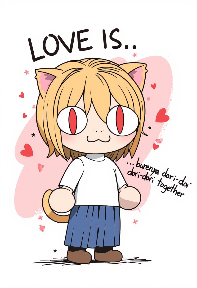 love1s. "love is" style illustration showing an image of Neco Arc, a chibi with short, messy, light tan hair. She has large, red eyes and cat ears. She is wearing white turtleneck sweater, blue pleated skirt, black thighs and brown footwear. She is embarrassed, her face covered with blush. At the top of the image there is an inscription "LOVE IS...", atr the bottom of the image isncription is "...burenya dori-dori-dori together". Both inscripton are bold italic font. Background is abstract and love-themed, with hearts and particles