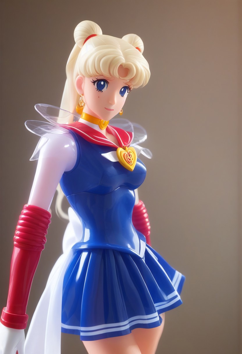 1girl, aausagi, long hair, double bun, twintails, hair ornament, parted bangs, tiara, earrings, blue eyes, heart choker, blue sailor collar, red bow, white shirt, see-through, elbow gloves, white gloves, multicolored skirt, white skirt, best quality, plastic toy world, Usagi Tsukino executing a spinning kick, skirt and hair flowing dramatically, front-view shot, vibrant and playful, glossy plastic shine, <lora:novuschroma53 style:1>, novuschroma53 style