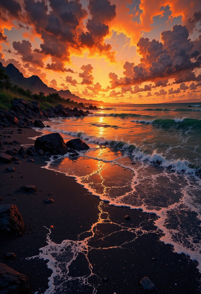 Tahiti Black Sand Beach – Sunset Glow & Volcanic Shoreline "A dramatic tropical beach in Tahiti, where black volcanic sand glistens under the golden hour light. The sun casts a fiery glow on the distant mountains, while gentle waves reflect the warm hues of sunset. The contrast between the glowing sky and the dark, polished shoreline creates an otherworldly and mesmerizing coastal scene."