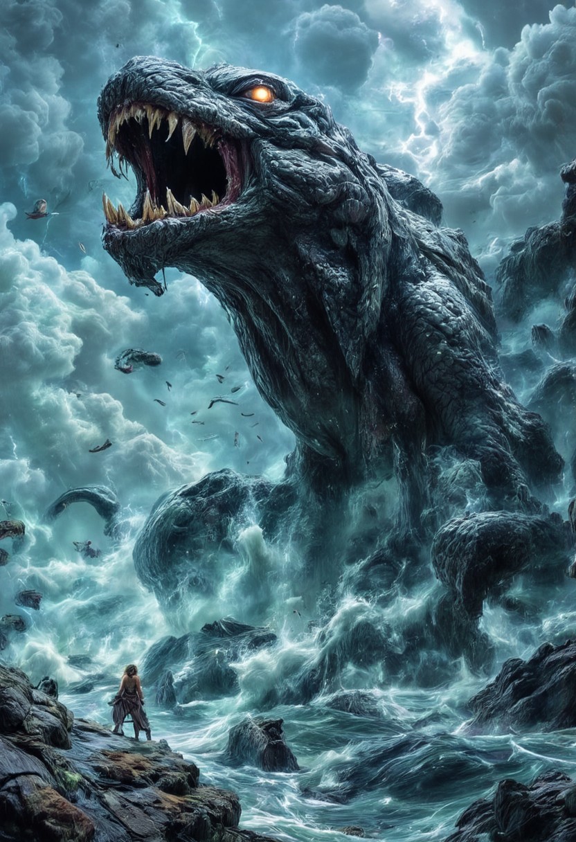 The Leviathan, a colossal sea creature of divine terror and majesty, rises from the abyss, its scaly, armored body glistening under a storm-ridden sky. Towering waves crash against its massive form as its serpentine body coils and twists, partially submerged in the churning ocean. Its gargantuan jaws, lined with jagged, glistening fangs, part to release an ear-shattering roar that shakes the heavens. Lightning illuminates the creature’s burning eyes, glowing with an unnatural, almost celestial fire. Its ridged back, covered in impenetrable plates, pierces through the water like jagged mountains, while its long, barbed tail lashes with the force of a tidal wave, scattering ships like driftwood. The surrounding sea is in chaos—wreckage of vessels old and new float aimlessly, remnants of past encounters with the unkillable beast. In the distance, horrified sailors cling to their shattered ships, whispering prayers as the living nightmare moves with deliberate, unstoppable force. A being of both divine wrath and enigmatic purpose, the Leviathan is no mere monster—it is a harbinger, a force beyond human understanding, its existence woven into the fabric of creation itself. Ultra-detailed, cinematic lighting, biblical mythological horror, epic oceanic destruction, dark and moody composition, monsterlora, mythology, dark fantasy