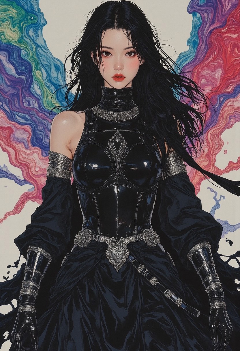 (pingtu style, illustration-fen) A woman stands in a realm of shifting hues, her porcelain skin stark against the abyssal folds of her vanta black robe, its fabric whispering as it floats unnaturally around her. Her serpentine eyes gleam beneath thick, black curls, their oily sheen catching the fractured light of the surreal aura swirling behind her—an optical illusion of vibrant colors warping the air itself into living visual art. Ornate silver and obsidian bands encircle her forearms and upper arms, intricate designs whispering of ancient power. Her beast plate armor glistens under the ethereal glow, sculpted to perfection, its dark metal absorbing light rather than reflecting it. A scarf drapes over one shoulder, caught in an unseen current, trailing like a specter of forgotten divinity. Her gaze, cold and commanding, locks onto unseen prey, her expression the perfect embodiment of beauty entwined with evil. The air vibrates with silent menace as the colors behind her pulse hypnotically, bending reality itself to her will.
