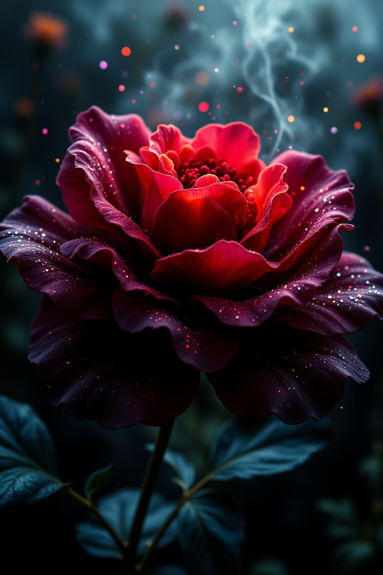 "A close-up of a beautiful black and red rose with dew drops on its petals, glistening under the soft light of a rainy day. The petals are rich, velvety, and deep red, with delicate rain droplets scattered across the surface, reflecting the light. The background is blurred, showing hints of green leaves and a soft mist, evoking a calm, serene atmosphere. The texture of the rose is enhanced by the wetness of the raindrops, giving the flower a fresh, vibrant look. The image conveys both elegance and tranquility, with a sense of natural beauty and renewal.",(masterpiece), best quality, expressive eyes, perfect face,(UHD:1.1),colors,(hyper detailed:1.1),intricately detailed,(fantastical:1),intricate detail,splash screen,(fantasy:1),(4k resolution:1),(masterpiece:1.1),complex background,(intricate detailed:1.1),bright colors,concept art,digital art,intricate,expert,insanely detailed,velvet_myst,aidmafluxpro1.1