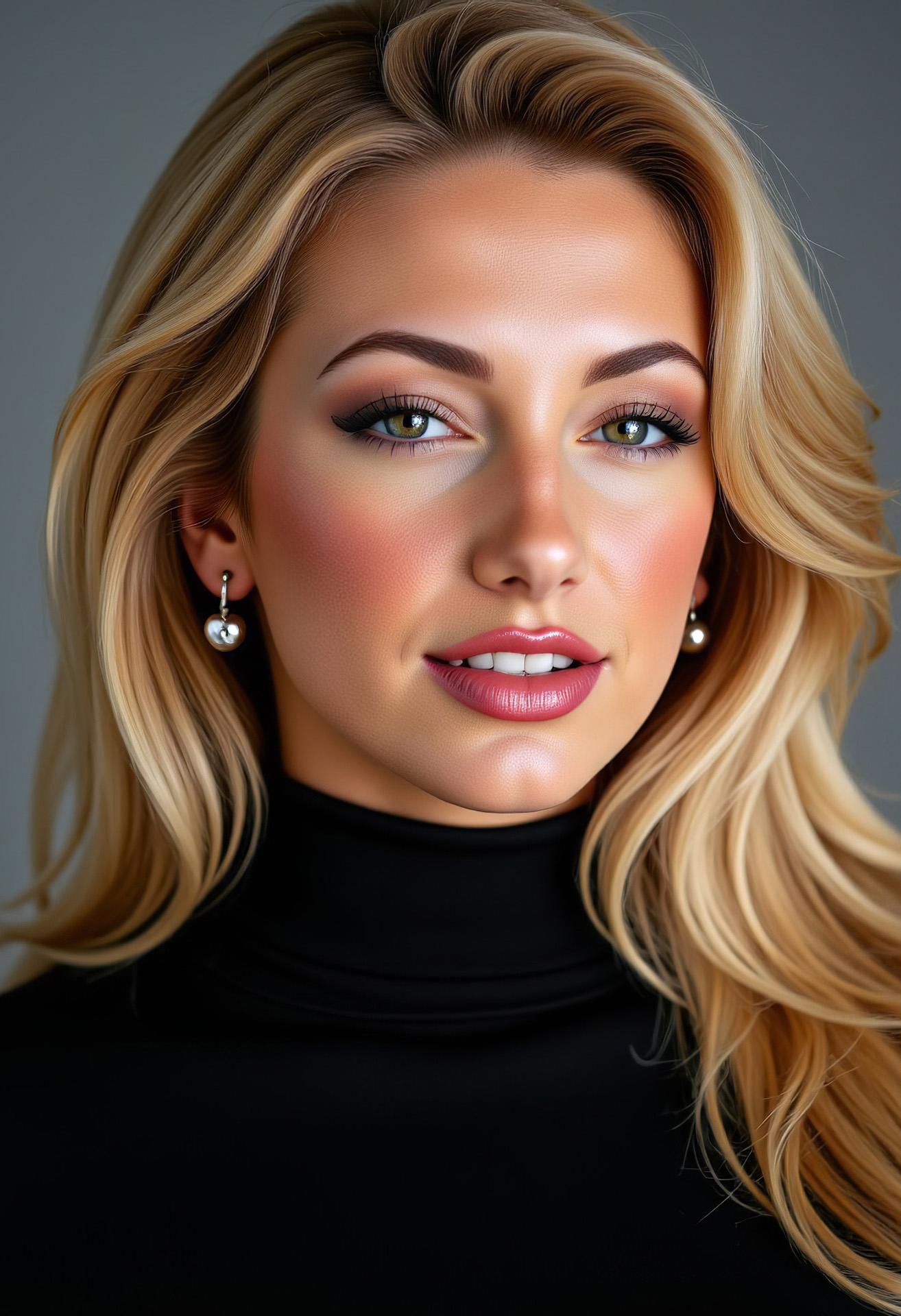 Create a professional facial portrait of a young, stunningly beautiful woman called Shyla Jennings. She has green eyes and a fair complexion. She has voluminous, long light blonde hair styled in loose waves that cascade around her face. Elegant makeup results in a stunning overall look. She wears a basic black turtleneck top. The top features a fine ribbed knit pattern. She wears fine silver dangling heart-shaped earrings. She looks into the camera flashing a suggestive smile. Her face expression is inviting and seductive. The professional light highlights her facial features perfectly, emphasizing the smooth textures of the skin and the fabric. Focus should be on face and hair. Realistic detail, realistic reflection detail.