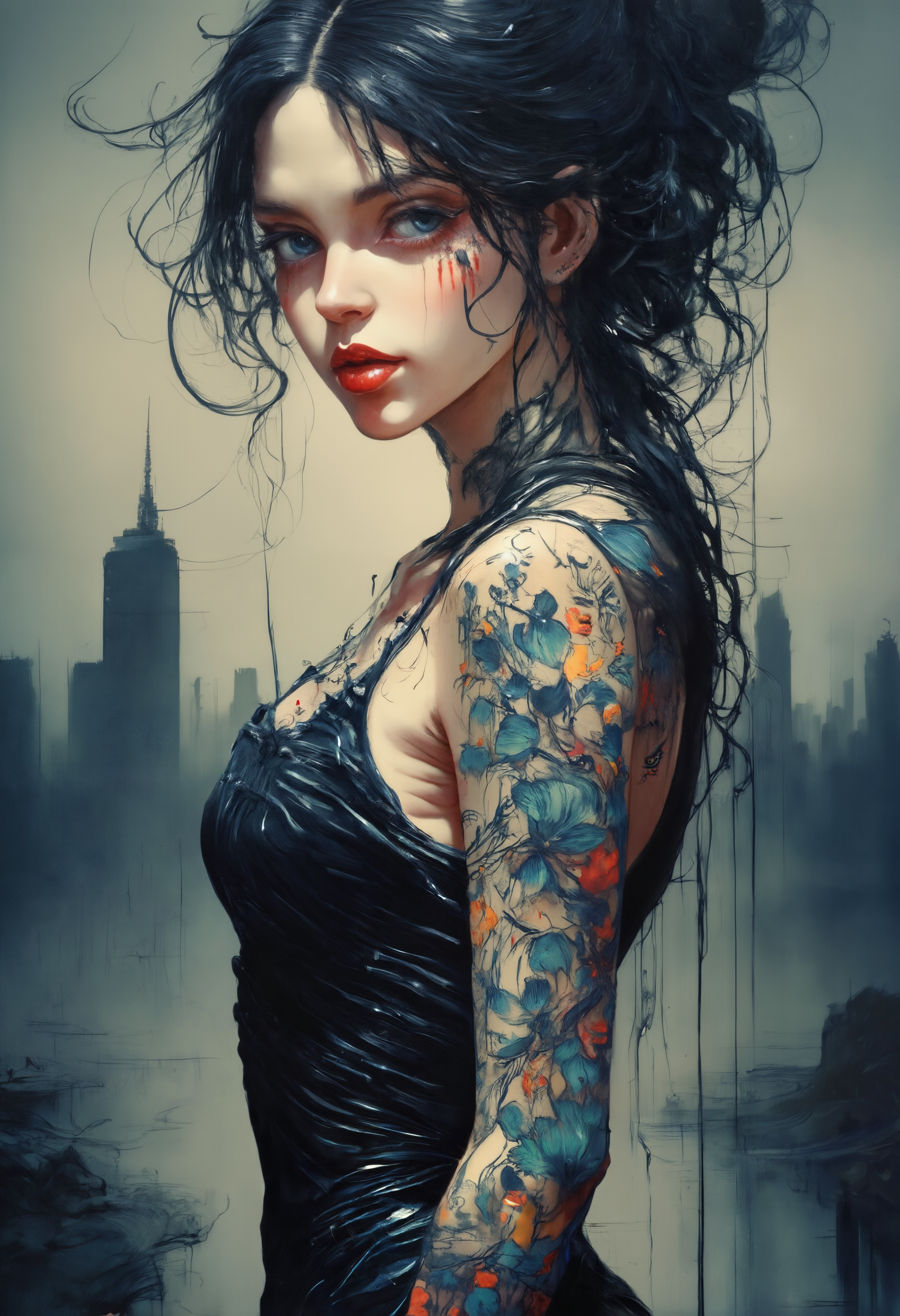YFG-Liqd Close-up, avant-garde, three-quarter view, portrait of a young woman with long hair with a ponytail, wearing balck silk dress, red lipstick, blue eyes, pale skin. Black and blue floral tattoos on her arm. City skyline in background.