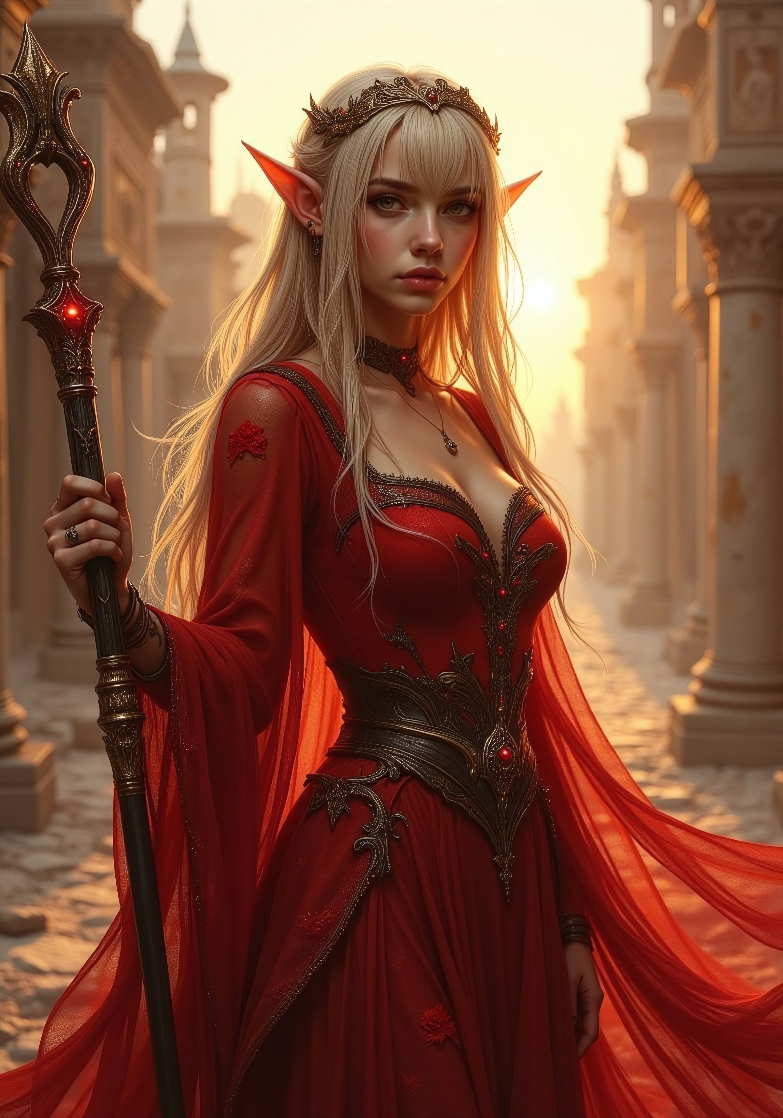 A high-quality digital artwork in the style of pinkdarkcanvas, masterpiece, best quality, good quality, very aesthetic, absurdres, newest, 8K, depth of field, focused subject, BREAK elf sorceress, vivid golden hair, circlet, bangs, sidelocks, gauzy, filmy red mage robes adorned with arcane symbols, holding arcane staff, ancient fantasy city, standing in dynamic pose, golden hour, directional lighting, vibrant colours, dutch angle