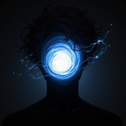 The image is a digital drawing in a dark, surreal style, featuring a stylized, abstract figure with a striking, otherworldly appearance. The subject's head is the most prominent feature, dominated by a swirling, glowing orb that occupies the center of the face, surrounded by an intricate, swirling pattern that resembles a vortex or a stylized eye. This orb emits bright, electric-like energy that crackles with blue-white light, creating a stark contrast against the dark background. The figure's hair is depicted as wild, curly, and flowing, almost as if caught in a gust of wind, with strands extending outward in a chaotic manner. The hair and face are rendered in dark, almost black tones, blending into the background, creating a sense of depth and dimension. planet-head,