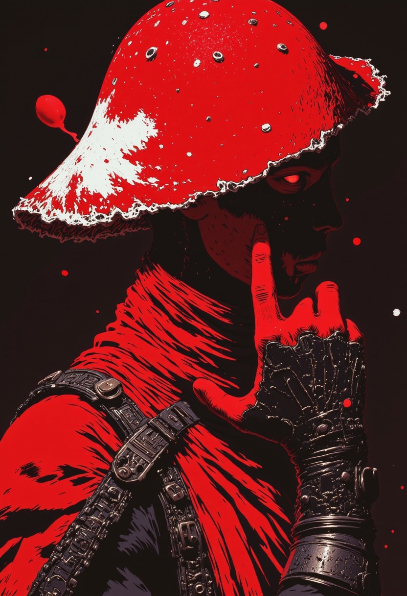 Hand Up stance, Fight stance, Action Pose, action scene, floating particles, high Budget Anime sequence, S1n0z1ck style, extreme Closeup of an retro art Ninja, flat color two toned in red and white, resembling a mushroom syberian masked intricate designed haitian Warrior in Relief high collar metal armor, cinematic lighting, insane details, hyperrealistic extreme closeup macro photography, 64 megapixel DSLR