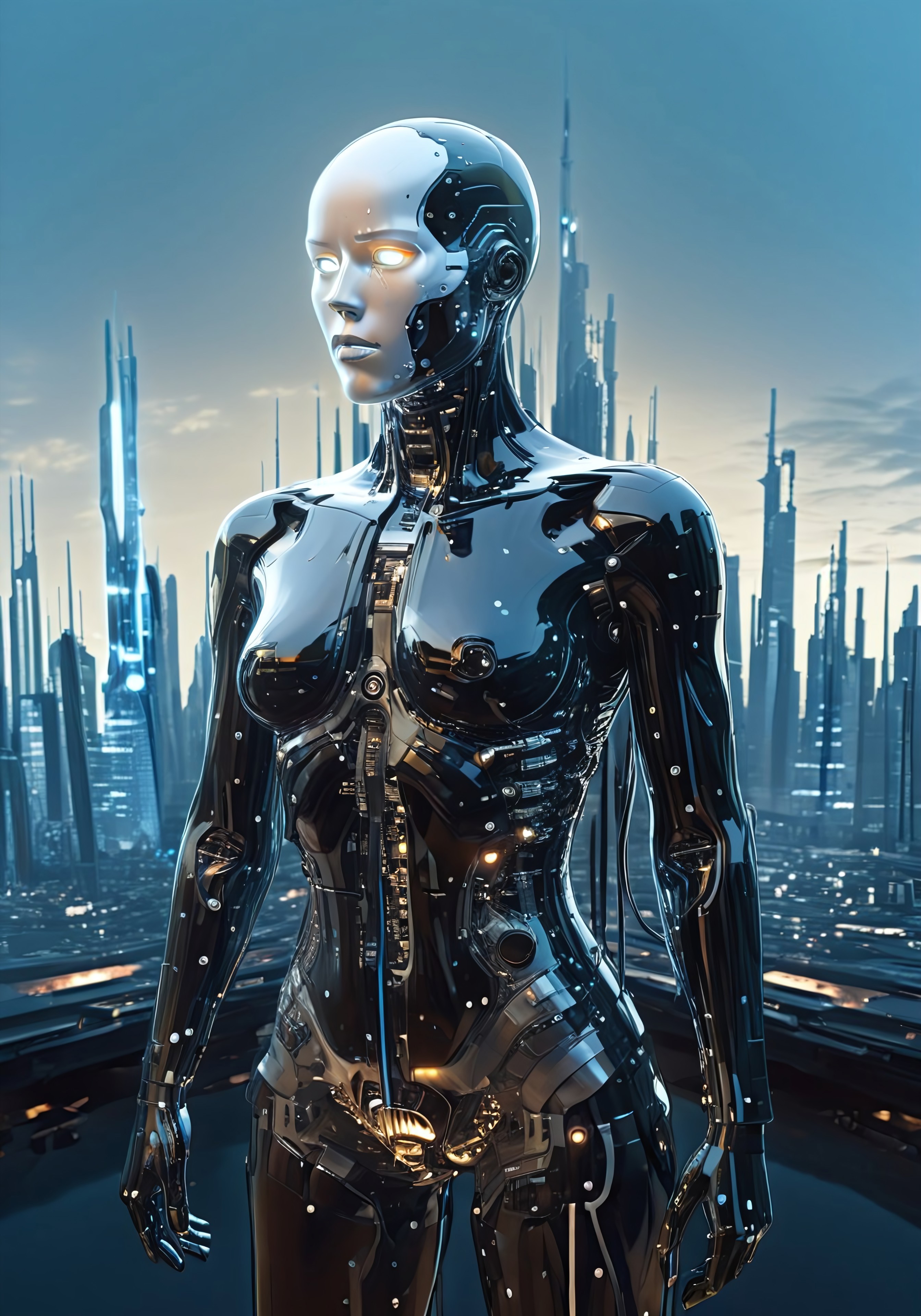 Blame! by Tsutomu Nihei see through cyborg, black oil splatter, is flying through a void of blue, silver plated cables everywhere, translucent glass head, electronics in background, black oil splatter, black everywhere, symbiotic everywhere, sword, glow, electric everywhere, futuristic skyline in background easynegative, ng_deepnegative_v1_75t