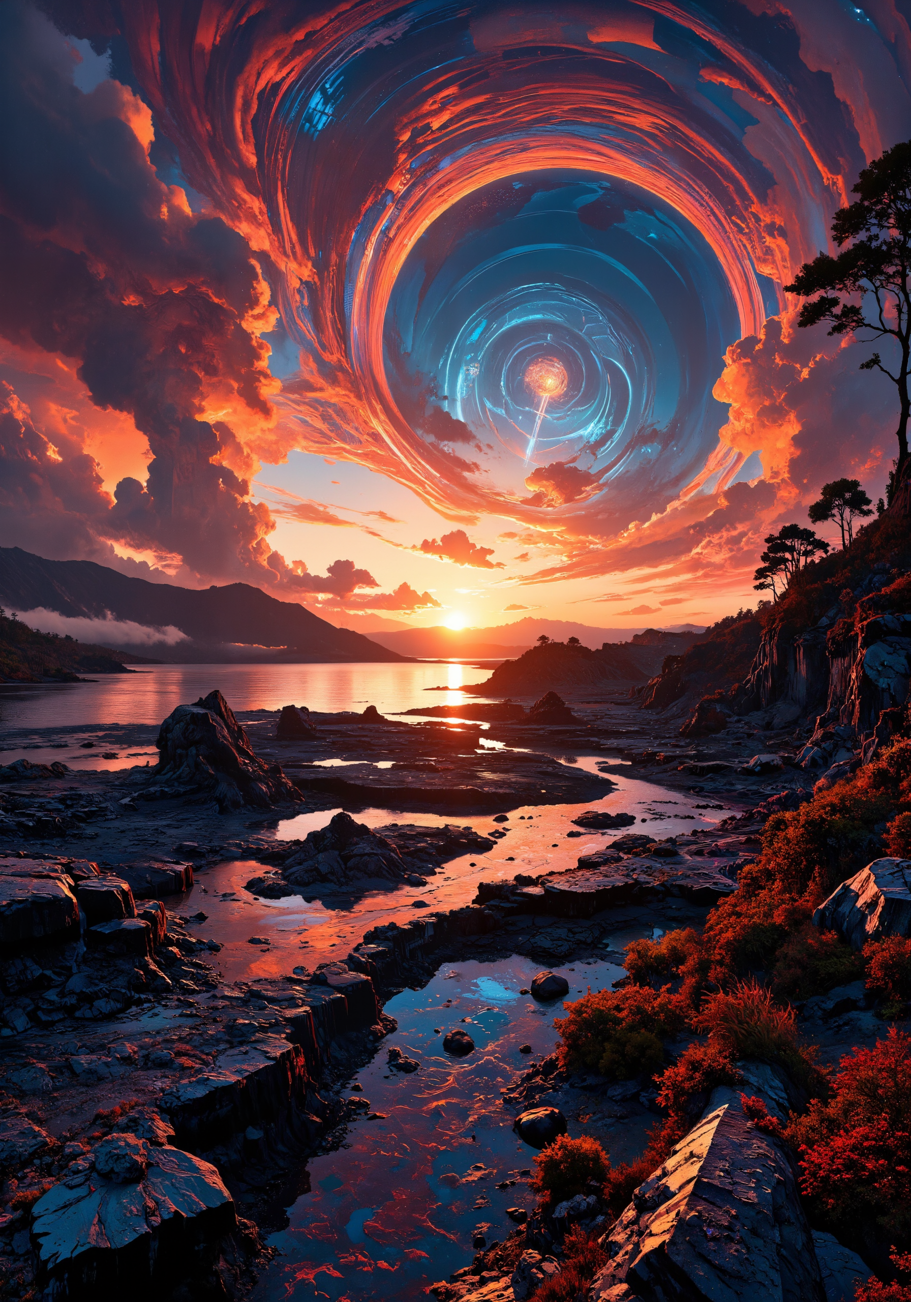Surrealist volcanic lakescape at sunset with holographic steam plumes refracting solar rays into chromatic halos. Mineral-rich atmosphere diffuses golden-hour light through suspended obsidian particles, creating violet-orange gradients with spectral dispersion effects. 8k ultra-detailed rendering of iridescent basalt formations reflecting in mercury-like waters. Polynesian-inspired geometric patterns emerge in swirling pyroclastic clouds, blending indigenous art motifs with atmospheric optics. Volumetric crepuscular rays pierce stratocumulus formations striated with manganese and copper deposits. Twilight transitions from molten cadmium reds to deep cerulean blues across liquid mercury pools, enhanced by subsurface scattering simulations. Ultra-wide angle composition emphasizing terrestrial heat distortion and ionospheric color separation. Photorealistic textures with impressionist light handling and subtle anamorphic lens flare artifacts. <lora:New_Fantasy_CoreV4_FLUX:0.4> <lora:Anime v1.3:0.7> <lora:Bruce Holwerda:0.4> <lora:Illustration concept Variant 3A:0.6> <lora:UkiyoFusion-FLUX:0.5> <lora:flux_dev:1>