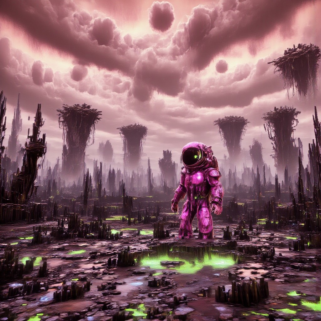 This image is an astronaut landing on an exotic planet. The astronaut's suit is a glistening, neon pink, as it lights up in use. It is afternoon on the planet and cloudy. The clouds are a light, pink hue in color, and look as fluffy as cotton candy. Faint rays of sunlight peer through the treetops above as the astronaut explores their surroundings. Various insects, mammaloids, and reptile-like creatures encompass the landscape with abundant vegetation. Make the creatures exotic, alien, and strange to what humans would find on Earth. The plants take in the gold flakes from the atmosphere and exude phosphate gas. The gas makes the sky appear green like a lettuce leaf. As the astronaut stands there, they are holding an iPad device, white in color, lined with blue neon trim, as it scans the various lifeforms.