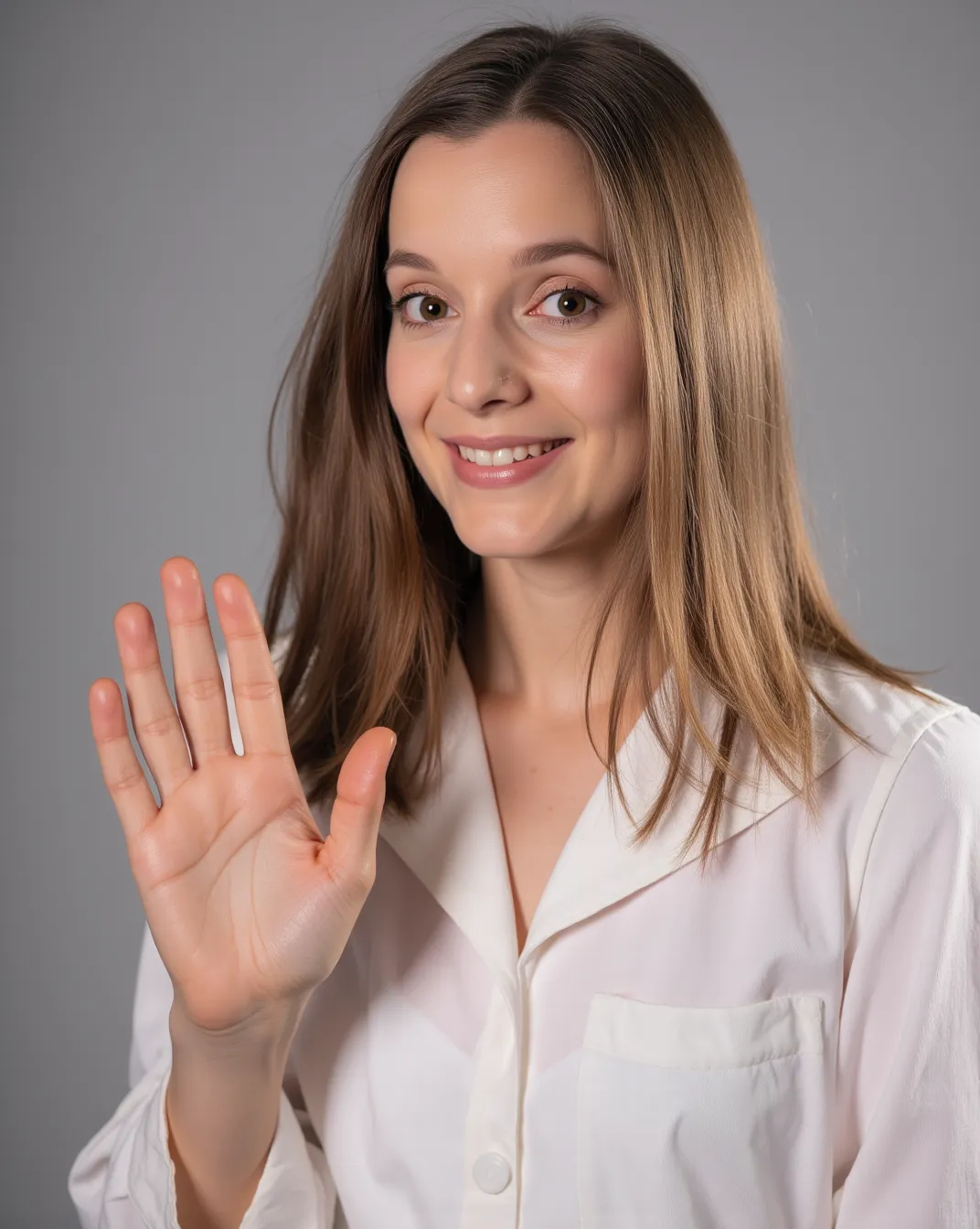 photoshoot of Zuzanna Grabowska, female, woman, solo, waving hello at the viewer.