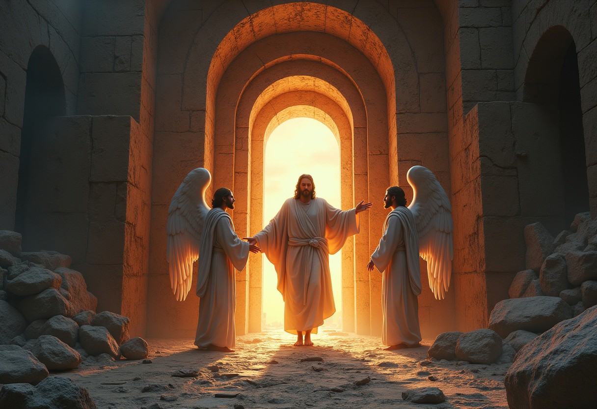 Jesus Christ Resurrecting from the dead, Two Angel Guarding the Entrance of the tomb and the tomb's door on the ground broken in pieces, Christian Resurrections of Jesus Christ Aesthetic, detailed matte painting, deep color, fantastical, intricate detail, splash screen, complementary colors, fantasy concept art, 8k resolution trending on Artstation Unreal Engine 5