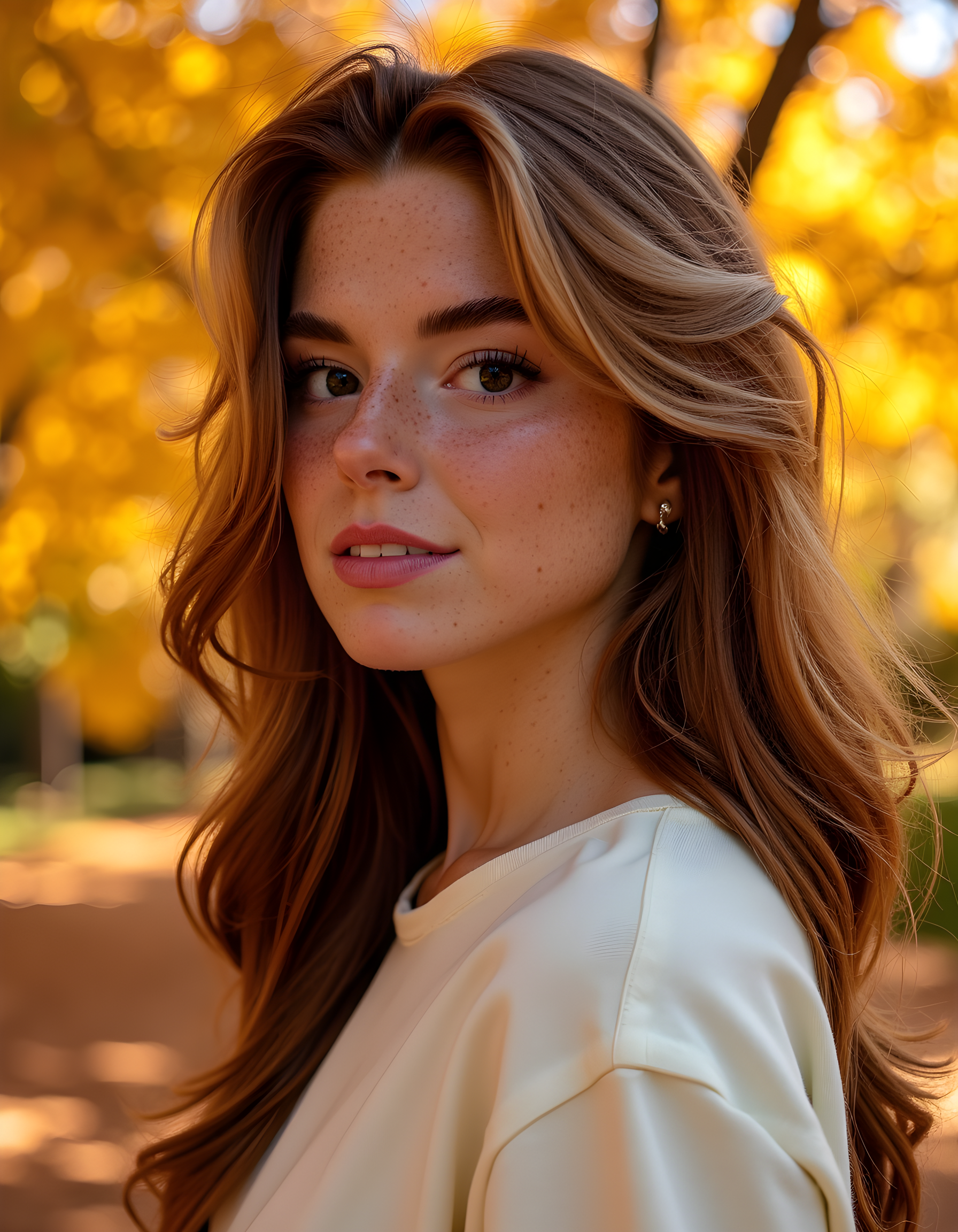 In a vibrant autumnal forest, with leaves of amber and gold cascading around, stands H4NN4H5T31N _ a woman of striking beauty with sun-kissed freckles, long brown hair, and blonde highlights. She wears a soft, white, long-sleeved shirt that contrasts against the forest's earthy tones. Her gaze is captivating as she directly addresses the viewer, her brown eyes sparkling with an enigmatic smile. The late afternoon sun casts dappled light through the canopy, creating a warm, soft glow on her face and highlighting the delicate features of her lips. A single strand of hair gently falls across her forehead, framing her visage in a portrait-like composition from a slightly elevated angle, capturing a moment of timeless allure.