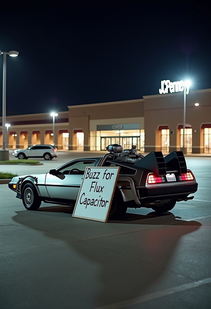 The realistic photograph depicts a nighttime scene at a shopping mall. The Back to the Future Delorean time machine (a silver DMC-12 Delorean car) is parked in the empty parking lot. There is a large sign board leaning against the Delorean that says “Buzz for Flux Capacitor”. In the distance behind the car, there is a JCPenney department store (with the text “JCPenney” in white). The Delorean is in focus and the background is blurry.