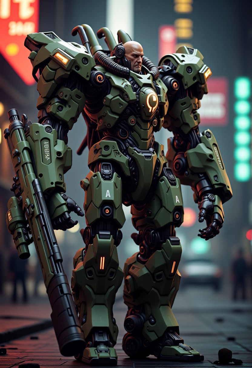 ten feet tall MechArmor, Large heavy mech, Large power armor, bulky, Off-center composition, close up, half-body shot, Male Face, Detailed Skin, Random Skin Tones, Caucasian, Blonde Hair, sides of head shaved, detailed facial expression, High details face, High detailed Eyes, warrior, cybernetic augmentations, cybernetic grey green battle armor with black intricate details, beard, holding a large heavy rifle, dynamic scene, Neon Cyberpunk Night City Cityscape Background, Cityscape, walking through a firefight in the streets, warm morning light, cybernetic robot retro cyberpunk, 80's inspired, synthwave, neon, vibrant, detailed, retro futurism. Android, AI, machine, metal, wires, tech, futuristic, highly detailed, Neon Cyberpunk Night City Cityscape Background, cinematic film still glamorous photo dark art by Rafael Zabaleta, expressionism art by Asger Jorn, vibrant, Abstract expressionism, experimental painting techniques, bold bright colors, dynamic compositions, Expressionism, emotive brushwork, brilliant tones, dramatic lighting, introspective themes. high fashion, luxurious, extravagant, stylish, sensual, opulent, elegance, stunning beauty, professional, high contrast, detailed. shallow depth of field, vignette, highly detailed, high budget, bokeh, cinemascope, moody, epic, gorgeous, film grain, grainy
