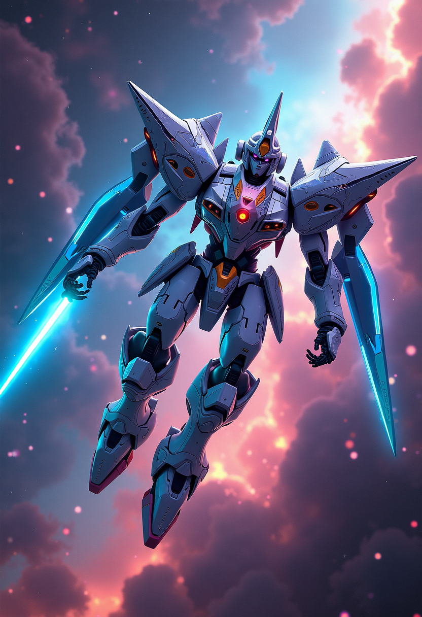 Suspended in orbit amidst a vibrant nebula, a lone mecha known as the Celestial Guardian hovers over an ancient cosmic shrine crafted from crystalline structures and pulsating energy. Its design marries futuristic technology with mystical artistry—swirling, iridescent patterns traverse its armor, mirroring the nebula’s shifting hues. Tasked with protecting the shrine from marauding space pirates and enigmatic interdimensional threats, the Guardian activates advanced energy shields and quantum laser arrays. As stellar winds dance around it and the shrine’s ambient glow intensifies, every calculated movement becomes a silent vow to preserve the delicate balance between forgotten mysticism and futuristic might.