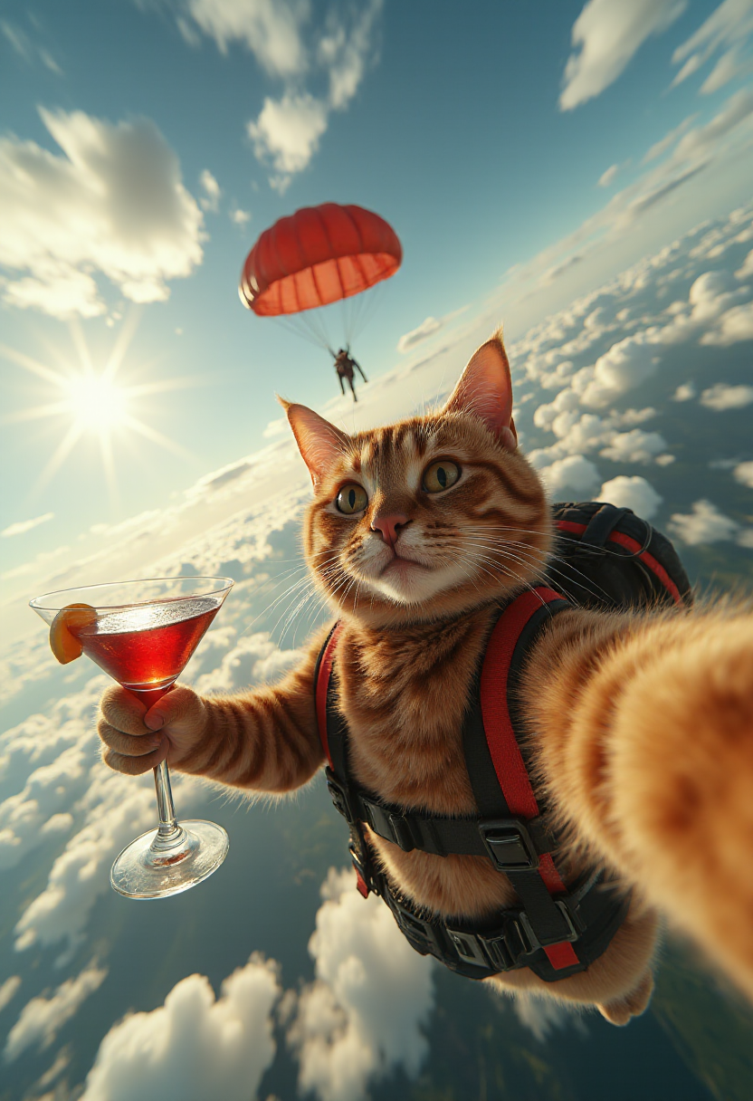 a red burma cat making a selfie ,in the sky down with parachute and a martini in the other hand, stunning image, realistic <lora:Cat_Selfies_from_around_the_world_r1:1>