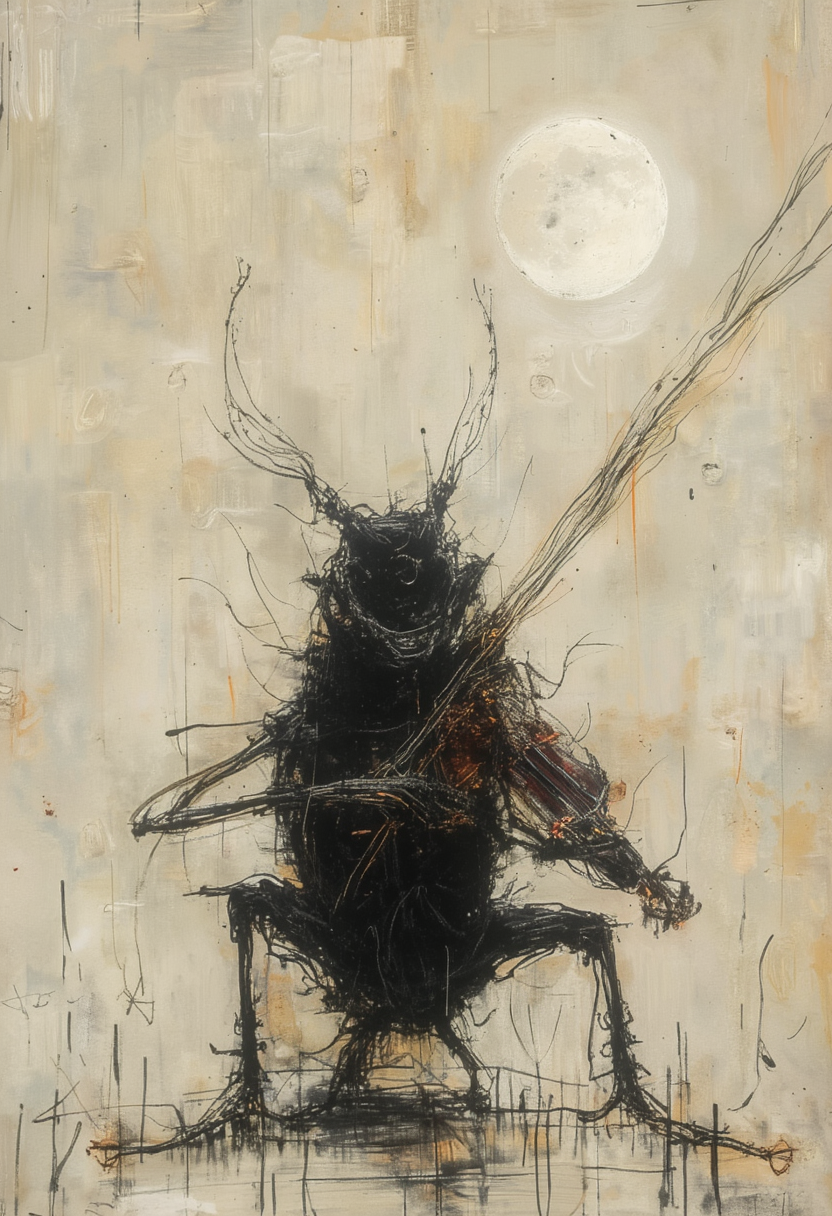 Contemplate the serenity within simplicity as a stark black cockroach musician appears in a minimalist abstract artwork, harmoniously tuning his rusty strings under soft moonlight. Clean lines meet bare canvas in monochromatic harmony, creating an understated yet captivating scene devoid of clutter. Enchanting shadows dance along the contours of this surreal duet as stark contrasts between light and darkness evoke profound emotion through intricate visual patterns. The symphony of shadows resonates against a canvas with an uncluttered composition, inviting introspection amidst the subtle beauty of this captivating encounter. ,<lora:flux/fav/OBä¸ä¸çºªæ²¹ç»v1.1.safetensors:1.0:1.0>