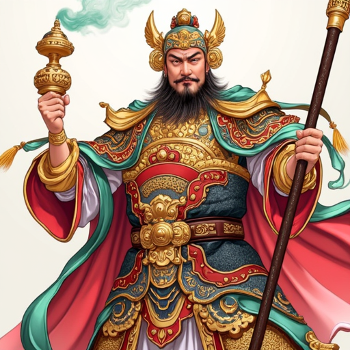 The image is a vibrant, detailed digital illustration of a powerful, imposing figure, likely a historical or mythological figure, depicted in traditional Chinese attire. The character stands in a commanding pose, holding a staff in his right hand and a golden, ornate incense burner in his left. His attire is ornate and rich, featuring a mix of gold, red, blue, and green colors.