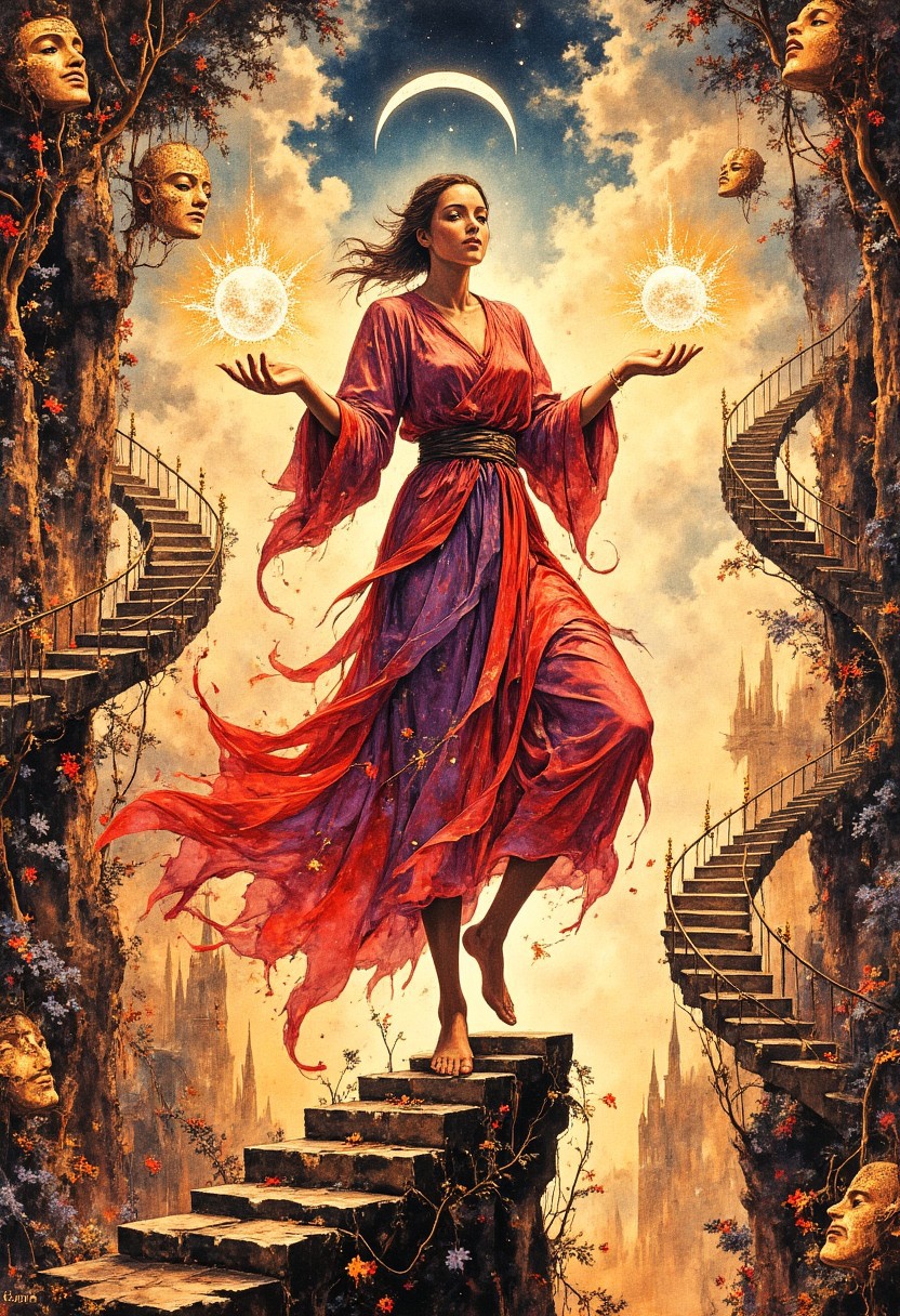 A whimsical yet mischievous scene rendered in a modern Art Nouveau style, capturing the enchanting narrative of illusion and deception with vibrant, dynamic imagery. The composition is infused with playful elegance and surreal mystery, blending flowing, organic lines with intricate, decorative patterns that dance around the central figure, creating an atmosphere of wonder and uncertainty. At the center of the scene is a figure with a lithe, nimble form, poised in a playful, acrobatic stance that exudes agility and grace. They are balanced precariously on one foot atop a narrow, crumbling ledge that juts out into the swirling chaos of the background. Their body leans forward with a poised, graceful arch, as if ready to leap into the unknown at any moment. Their posture is dynamic and fluid, capturing a sense of motion and spontaneity, emphasizing their mischievous, unpredictable nature. The figure’s face is concealed behind a theatrical mask with a wide, crooked smile that stretches unnaturally across its surface. The mask is painted in bright, vibrant colors—gleaming golds, rich purples, and deep scarlets—adorned with swirling patterns and delicate, shimmering accents. The exaggerated, curved smile gives the mask an eerie, playful appearance, enhancing the sense of trickery and deception. The mask’s hollow eyes are dark and shadowed, giving no hint of the true face beneath, adding an air of mystery and intrigue. They are dressed in a flowing, multicolored robe that billows around them with a life of its own, swirling and twisting as if caught in an invisible breeze. The robe is impossibly light and fluid, crafted from shimmering fabric that reflects light in rippling waves, creating an illusion of constant motion. The swirling patterns on the robe are intricate and hypnotic, painted in vibrant shades of red, purple, and gold that blend seamlessly into one another, enhancing the surreal, whimsical ambiance. The edges of the robe are adorned with delicate gold thread, glistening faintly as the fabric twists and curls through the air. In their hands, they juggle glowing orbs of light that pulse and flicker with an ethereal, otherworldly glow. The orbs are perfectly spherical, their surfaces swirling with shimmering, golden mist that twists and spirals hypnotically within the transparent spheres. The light emitted by the orbs is soft and mesmerizing, casting faint, shifting reflections on the figure’s robe and the swirling chaos of the background. Each orb represents illusion and deception, their delicate, shimmering light contrasting beautifully with the vibrant colors around them. The background is a fantastical world of chaos and surreal wonder, painted in swirling hues of red, purple, and gold that flow and twist in mesmerizing, fluid patterns. Shifting staircases spiral through the air, twisting and contorting into impossible shapes, their steps leading nowhere. The staircases are adorned with delicate carvings and gilded railings, their ornate designs enhanced by the swirling colors that cascade around them. Mirrored pathways intersect and spiral outward, reflecting distorted images of the figure and the glowing orbs, enhancing the sense of illusion and uncertainty. The vibrant colors of the background are bold and dynamic, blending seamlessly into one another with soft gradients and flowing brushstrokes that create a dreamlike, hypnotic effect. The swirling patterns dance and shift fluidly, forming swirling vortexes and spiraling tendrils that weave through the air, adding to the sense of chaos and enchantment. The vibrant hues are enhanced with delicate, shimmering highlights that give the swirling colors a luminous, otherworldly glow. Above the figure, a crescent moon hangs upside down, its delicate, curved edges gleaming softly with an eerie, playful light. The moon is painted in a pale, silvery gold, its surface adorned with delicate, swirling patterns that twist around its edges. The upside-down position of the crescent moon enhances the surreal, whimsical atmosphere, suggesting a world turned upside down, ruled by illusion and trickery. The soft, silvery light from the moon diffuses gently through the swirling colors, casting a delicate, ethereal glow over the scene. The intricate border of the scene is adorned with twisting vines and delicate, flowing patterns that spiral gracefully around the edges. The vines are painted in soft, golden hues, their delicate leaves shimmering with faint, iridescent highlights. Interwoven among the vines are theatrical masks, each one smiling differently, their exaggerated, crooked smiles hinting at the ever-changing nature of the Trickster. The masks are intricately detailed, painted in vibrant colors with shimmering gold accents, their hollow eyes reflecting the mischievous light of the glowing orbs. The lighting is soft and atmospheric, blending warm golden hues with cool purples and deep scarlets to create a vibrant, dynamic ambiance. The soft, glowing light from the orbs and the crescent moon enhances the whimsical, otherworldly atmosphere, casting delicate highlights on the swirling patterns and flowing robes. The shadows are rich and fluid, flowing seamlessly into the swirling colors, enhancing the fluid, harmonious composition. The color palette is bold and dynamic, dominated by vibrant reds, purples, and golds that swirl and twist in mesmerizing patterns. The rich, vibrant hues contrast beautifully with the soft, ethereal glow of the orbs and the delicate, shimmering highlights on the figure’s robe. The flowing watercolor washes and delicate gradients enhance the impressionistic, dreamlike quality of the painting, capturing the fluid, ever-changing nature of illusion and trickery. This modern Art Nouveau styled painting is a masterful blend of whimsical elegance, surreal mystery, and vibrant, dynamic movement. It captures the playful, mischievous nature of illusion and deception, embodying the enchanting power of the Trickst