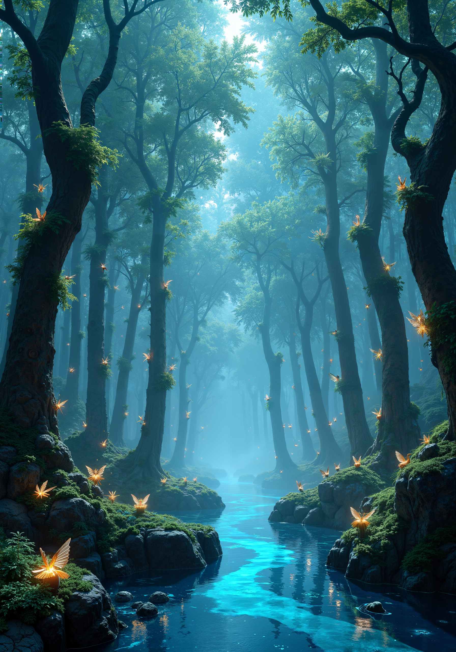 A sprawling glass forest with translucent, dendritic trees containing liquid mercury veins, rooted in floating islands of calcified time covered in interlocking gears and clockwork moss. Above, a shimmering aurora of quantum foam refracts through crystalline leaves, casting prismatic shadows that crawl across hyperdetailed bark textures in reverse chronological order. Bioluminescent mist swirls around mercury-bodied hummingbirds with crystalline wings displaying impossible fractal migration patterns. At the forest's core, a pulsating chrono-nucleus emits inverted gravity waves, causing obsidian rock formations to float upward while liquid time pools defy viscosity, their surfaces reflecting overlapping eras. 8k hyperrealism with surrealist biomechanical details, iridescent mercury silver and electrified cobalt hues, and luminous jade accents. Haunting beauty intertwined with temporal dissonance, rendered in maximalist steampunk-baroque style. <lora:NeonFantasyPrimeFLUX-000049:0.1> <lora:zyd232_Ink_Style_Flux1D_v1_1:0.3> <lora:flux_dev:1>