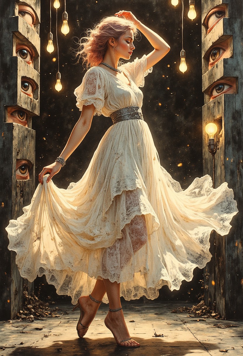 A striking scene rendered in hyper-realistic detail, capturing the haunting beauty and surreal elegance of a woman poised gracefully in a pirouette within a modern, dimly lit space. The composition is infused with a dynamic, avant-garde ambiance, blending ethereal beauty with an unsettling, voyeuristic edge that evokes a sense of modern femininity and artistic depth. The interplay of soft, golden light and deep shadows creates a cinematic atmosphere that is both intimate and eerie. She stands poised on one delicate foot, her body balanced with impeccable grace as she spins lightly on the ball of her foot, her other leg lifted gracefully behind her in perfect alignment. Her posture is fluid and harmonious, her body curving elegantly as she maintains her delicate, ethereal pose. Her slender arms are raised in a graceful arc above her head, her fingers curled softly, enhancing her delicate, angelic presence. Her posture exudes a sense of poised vulnerability, capturing the fleeting beauty of the moment with serene, melancholic elegance. She is dressed in a sheer, layered white lace dress that cascades around her body in flowing, translucent waves. The delicate fabric is impossibly light, rippling and fluttering around her slender form as she twirls gracefully, enhancing the sense of fluid movement and ethereal beauty. The lace is intricately detailed, adorned with swirling floral patterns and delicate filigree designs that shimmer faintly under the dim golden light. The translucent layers subtly reveal the elegant contours of her figure beneath, enhancing her delicate femininity while maintaining an air of modesty and grace. The hem of her lace dress flows gracefully around her legs, swirling in delicate arcs that echo the flowing, curved lines of her posture. The delicate layers of fabric are crafted with impossibly fine lace that catches the soft, golden glow of the vintage lightbulbs, reflecting delicate, shimmering highlights that enhance her ethereal, otherworldly presence. The flowing lace is impossibly delicate, blending seamlessly with the dimly lit background and enhancing the surreal, dreamlike ambiance of the scene. Her curly, pastel pink hair cascades down her back in loose, voluminous waves, its delicate, muted hues glowing softly as they catch the dim, golden light. The flowing curls ripple gracefully with the slightest movement, enhancing the fluid, harmonious composition of the scene. Her hair is impossibly soft and silky, its delicate pastel shades complementing the ethereal white lace of her dress, enhancing her angelic, delicate presence. Some curls fall loosely around her face, framing her serene, introspective expression with delicate, flowing lines. Delicate silver jewelry adorns her neck, wrists, and fingers, glistening softly in the dim golden light. She wears a thin, elegant silver choker adorned with delicate, swirling patterns that mirror the floral designs on her lace dress. The choker rests gracefully against her exposed collarbone, catching the soft light and enhancing the delicate curve of her neck. Her wrists are adorned with delicate silver bracelets that glimmer faintly as they catch the dim light, adding a touch of delicate, understated luxury to her ethereal presence. Her face is serene and introspective, her eyes gently closed as she twirls gracefully, her expression one of quiet melancholy and emotional depth. Her features are delicate and harmonious, her lips softly parted in a gentle, peaceful smile that conveys a sense of quiet acceptance and emotional vulnerability. Her long lashes cast delicate shadows on her flushed cheeks, emphasizing the tender vulnerability and serene beauty of her expression. Her face is illuminated by the soft, golden glow from the vintage lightbulbs, its warm, ethereal light enhancing the delicate contours of her face and emphasizing her angelic, otherworldly presence. The background is a surreal, modern space infused with an avant-garde, artistic ambiance. Surrounding her are geometric wall panels with sharp, angular designs that create a dynamic, fragmented backdrop. The panels are sleek and minimalist, their reflective surfaces casting elongated shadows that enhance the dramatic, moody atmosphere. The angular lines of the geometric patterns contrast beautifully with the flowing curves of her lace dress and the delicate waves of her pastel hair, enhancing the harmonious, dynamic composition. There is an eerie, voyeuristic presence within the geometric panels, as lifelike, hyper-realistic eyes peer through the holes in the wall, watching her every movement. The eyes are impossibly vivid and expressive, their detailed irises glistening softly with an eerie, lifelike glow. They vary in shape and size, some wide and curious, others half-lidded and melancholic, enhancing the unsettling, voyeuristic narrative. Their presence is haunting and surreal, adding a sense of tension and emotional depth to the composition. Clusters of exposed vintage lightbulbs hang above her, their dim, golden glow casting a delicate, atmospheric radiance over her twirling form. The lightbulbs are intricately detailed, their filaments faintly visible as they emit a nostalgic, warm light that enhances the surreal, cinematic ambiance. The soft, golden light wraps around her figure, casting gentle, flowing shadows that enhance her delicate curves and ethereal presence. Far above her head, an overhead soft spotlight casts a focused, golden beam that illuminates her figure with dramatic, dynamic contrasts. The spotlight is soft and diffused, creating delicate chiaroscuro effects that sculpt her form with gentle, flowing curves and delicate highlights. The focused light creates a dramatic, cinematic composition, enhancing her ethereal beauty and emphasizing the intricate lace details of her flowing dress. The atmosphere is intimate and eerie, infused with a surreal, avant-garde edge that enhances the emotional depth and melancholic beauty of her poised, delic