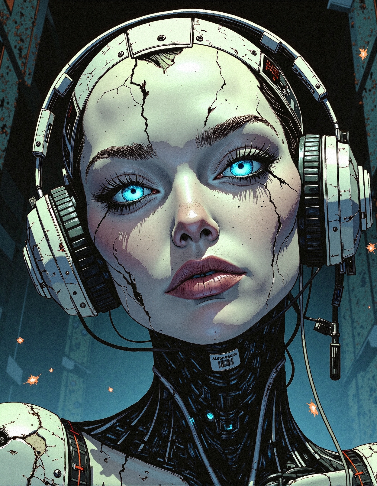Comic book illustration, 2d A breathtaking hyper-detailed cybernetic portrait of a forgotten android abandoned in a dystopian wasteland, her once-perfect synthetic skin now fractured, revealing a complex mesh of exposed wiring, rusted mechanical plating, and embedded data chips flickering weakly with residual power. Her glowing blue eyes, hauntingly expressive, radiate both sorrow and defiance, with coolant streaks running down her porcelain-like face, resembling artificial tears frozen in time. Her heavy, industrial-grade headset, covered in dirt and chipped paint, hums faintly with static interference, remnants of long-lost transmissions still echoing in her fading consciousness. Her battle-worn limbs, adorned with peeling barcodes and faded serial numbers, feature intricate mechanical components, visibly degraded and barely holding together with patches of electrical tape and improvised repairs. The background is dark and chaotic, an abandoned cyberpunk dystopia of corroded metal and flickering neon debris, with sparks occasionally flaring from malfunctioning machinery. The atmosphere is thick with dust and oil, creating an immersive, cinematic realism where every meticulously rendered crack, every worn-out circuit, and every subtle glow of her failing power core tells the story of an AI left to die in a world that no longer remembers her. <lora:FluxDFaeTasticDetails:0.3> <lora:Comic_Style_-_FLUX:0.6>