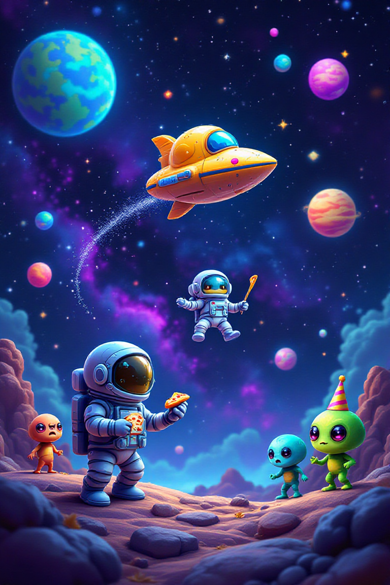 Create a pixel-art scene of a vibrant galaxy filled with quirky, cartoonish planets and stars. A tiny, pixelated astronaut with an oversized helmet is floating in zero gravity, holding a slice of pizza in one hand and a joystick in the other. Surrounding them are pixelated aliens with goofy expressions, one of whom is wearing a party hat. The background features a massive, pixelated spaceship shaped like a rubber duck, with a trail of glittering stardust behind it. The scene is both funny and picturesque, blending humor with an exciting, awe-inspiring space adventure.